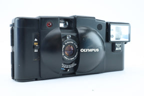 The Olympus XA2 is a legendary 35mm compact camera, praised for its sleek clamshell design, excellent lens, and dead-simple operation. Equipped with a sharp D.Zuiko 35mm f/3.5 lens and paired here with the detachable A11 flash unit, this pocket-sized camera is ideal for street, travel, and everyday photography.