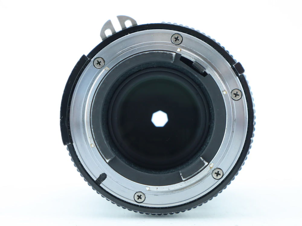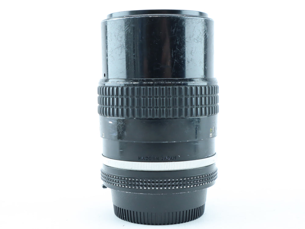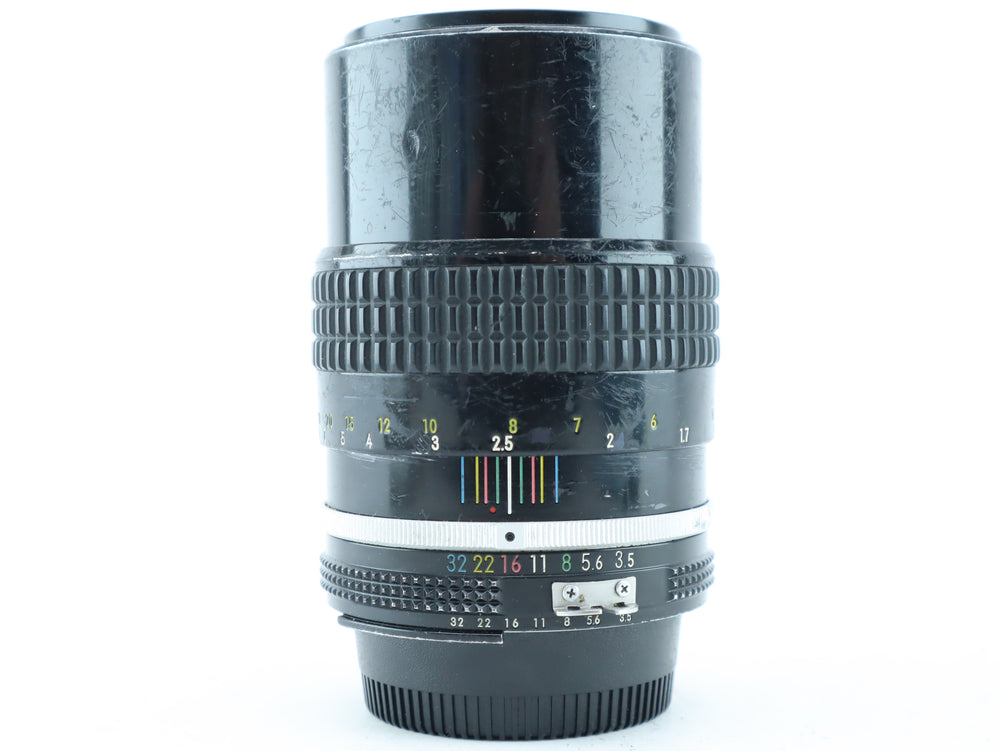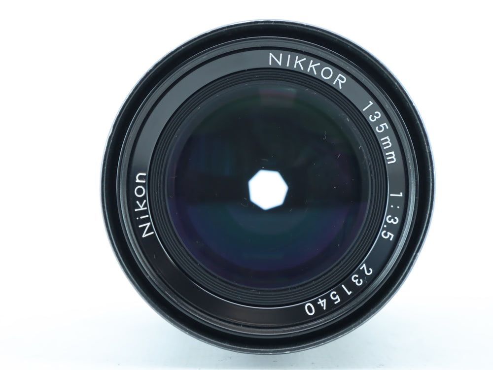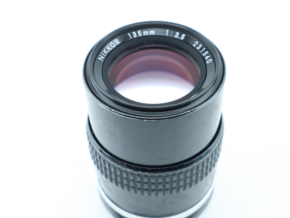 This Nikon Nikkor 135mm f/3.5 lens is in working condition, with clean optics free from haze or fungus, ensuring sharp images. The focus ring moves smoothly, and the aperture blades are snappy and oil-free. However, the lens has visible user marks and cosmetic wear on the barrel, which do not affect optical performance.