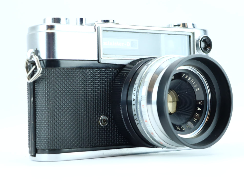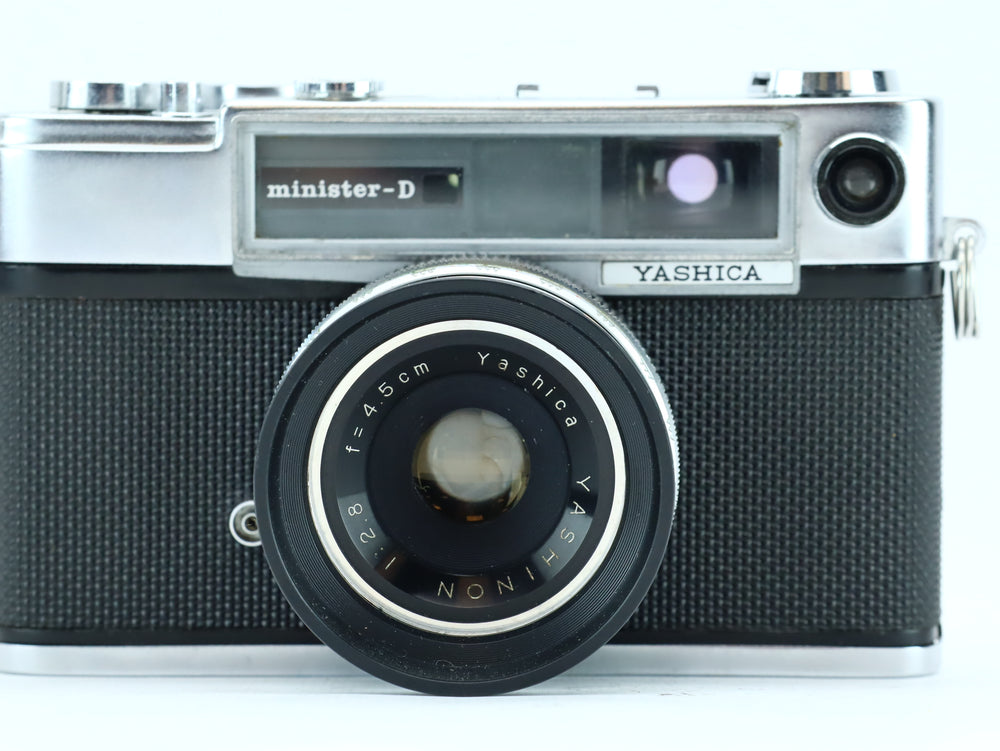 The Yashica Minister-D is a Japanese 35mm rangefinder camera from the mid-1960s, known for its high build quality and ease of use. It features a fixed Yashica 45mm f/2.8 lens with a clean rendering style, a coupled rangefinder for accurate manual focusing, and a built-in selenium light meter that operates without batteries.