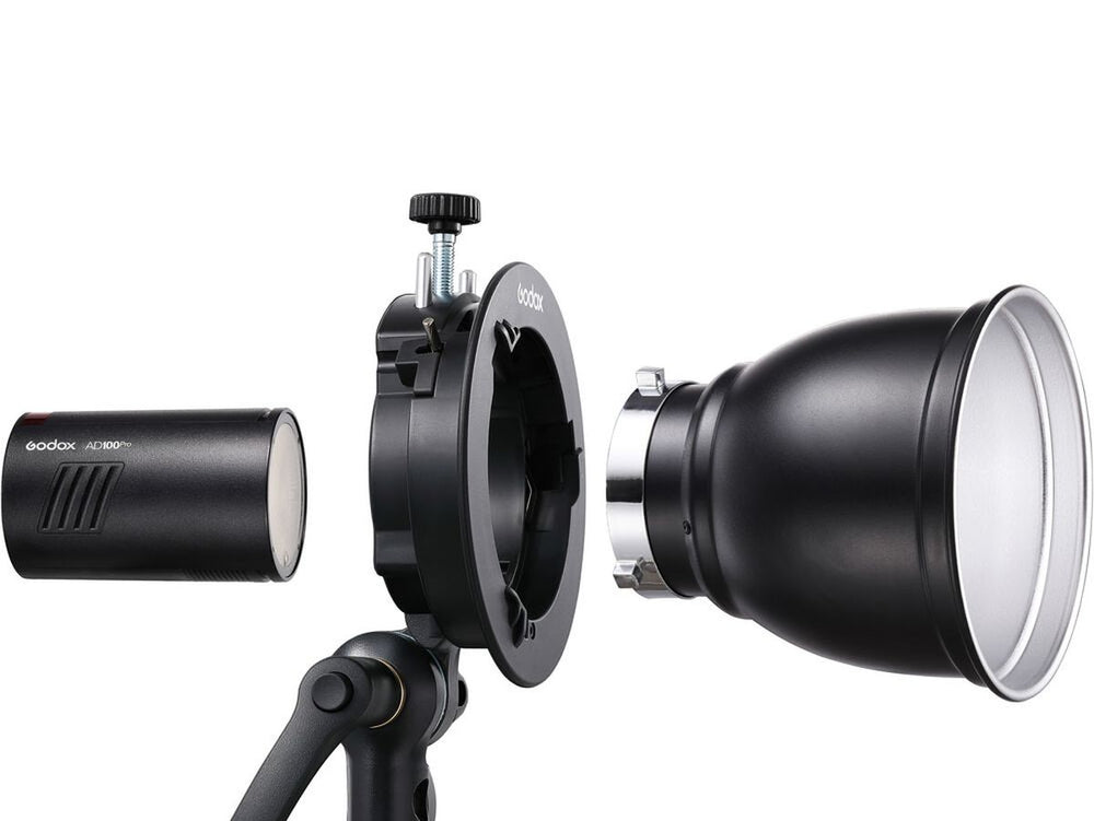 The flashlight sports a round flash head that spreads light in a circular pattern. Furthermore, it is magnetically designed, allowing compatibility with several accessories and light formers to produce any required lighting effects. The optional magnetic AK-R accessory kit can be used to expand the potential of the Godox AD100 Pro. Attaching the flashlight to the optionally available S2-bracket makes it usable with various Bowens light formers.