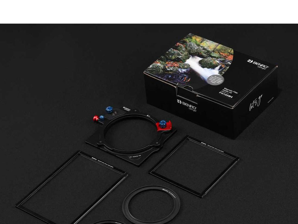 The Benro FH100M4 mkIV Magnetic Filter Holder package incorporates a magnetic FH100M4 filter holder, a 100x100mm magnetic frame, a 100x150mm magnetic frame, a 77mm adapter ring, and an 82mm adapter ring.