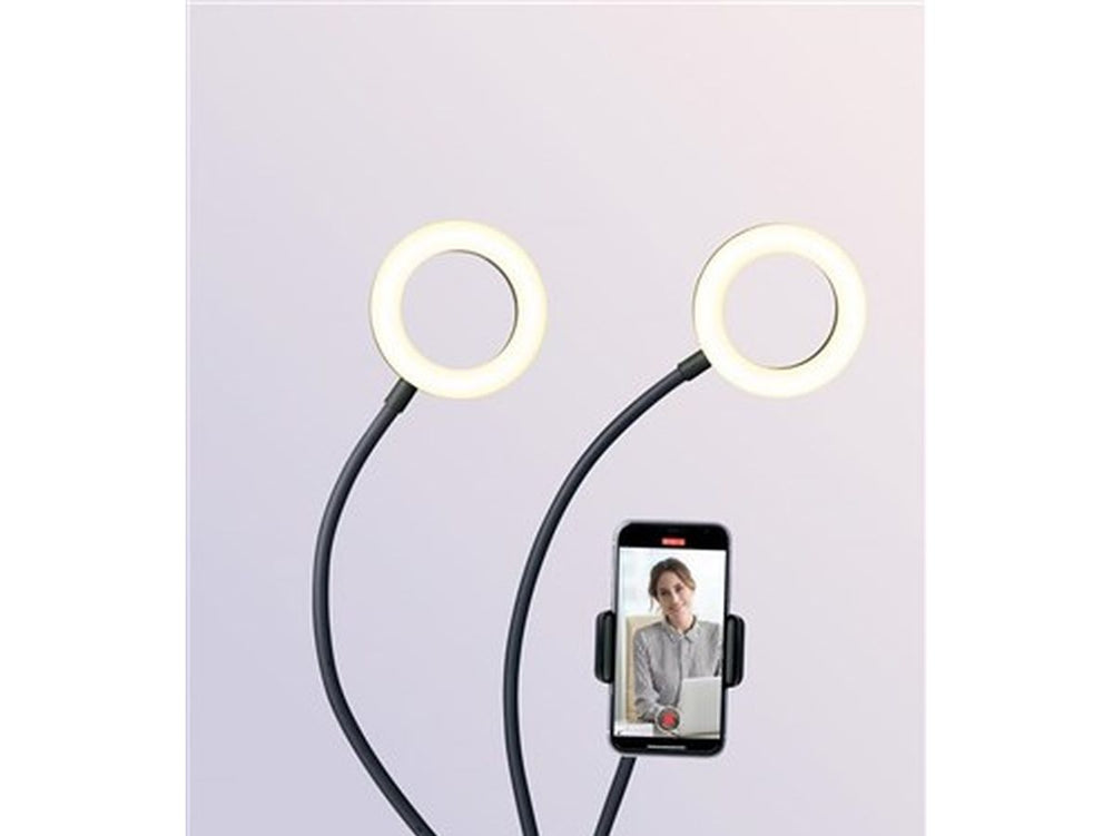 The Selfie Dual Ring Light comes with a table clamp that can easily be attached to the edge of a table with a maximum thickness of up to 5.5 cm. The smartphone holder is designed to accommodate mobile phones with widths ranging between 60 and 90 millimeters. The clamps of the smartphone holder are rubber-coated to provide secure usage. Power for the ring light is sourced through your computer's or laptop's USB port.