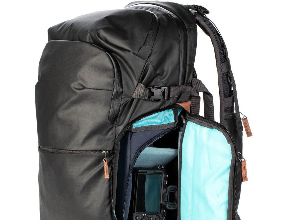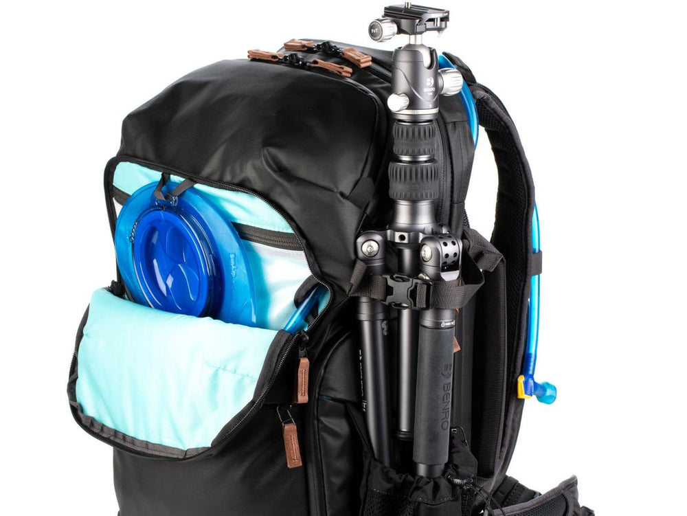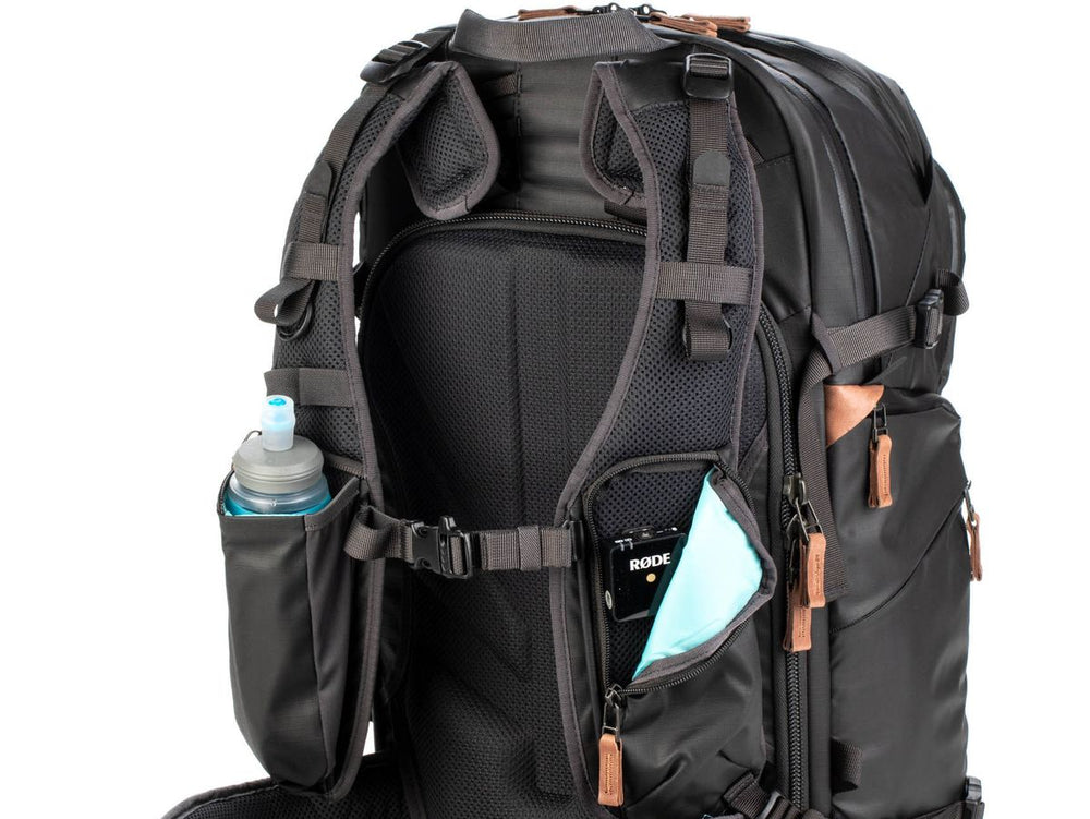 The height of the rear panel is customizable to fit photographers of varying torso lengths, while the pre-curved shoulder straps contribute to further comfort. The backpack also includes a concealed compartment for passports and travel documents, and features a wide strap enabling attachment to a trolley suitcase.