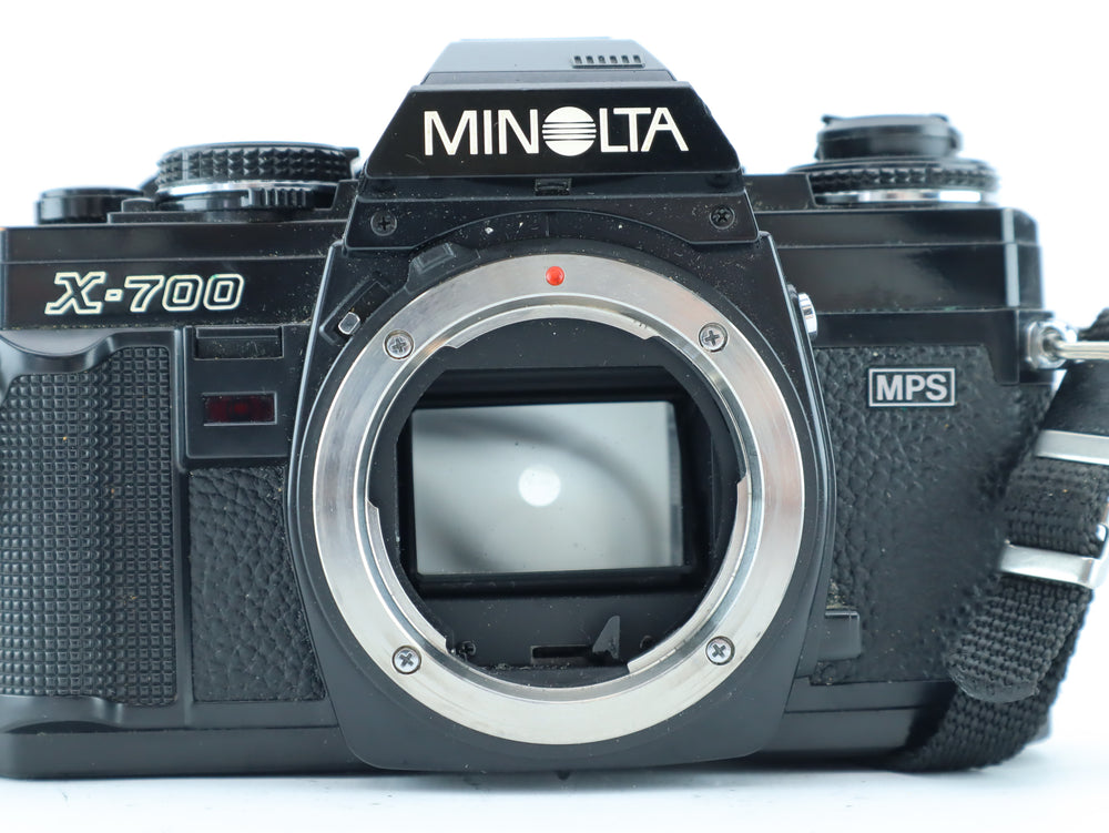 The Minolta X-700 MPS is a classic 35mm SLR film camera, popular among both beginners and advanced photographers for its balance of manual control and automation. Featuring manual, aperture-priority, and full program auto exposure modes, it offers great versatility with Minolta's legendary SR/MC/MD lens mount.