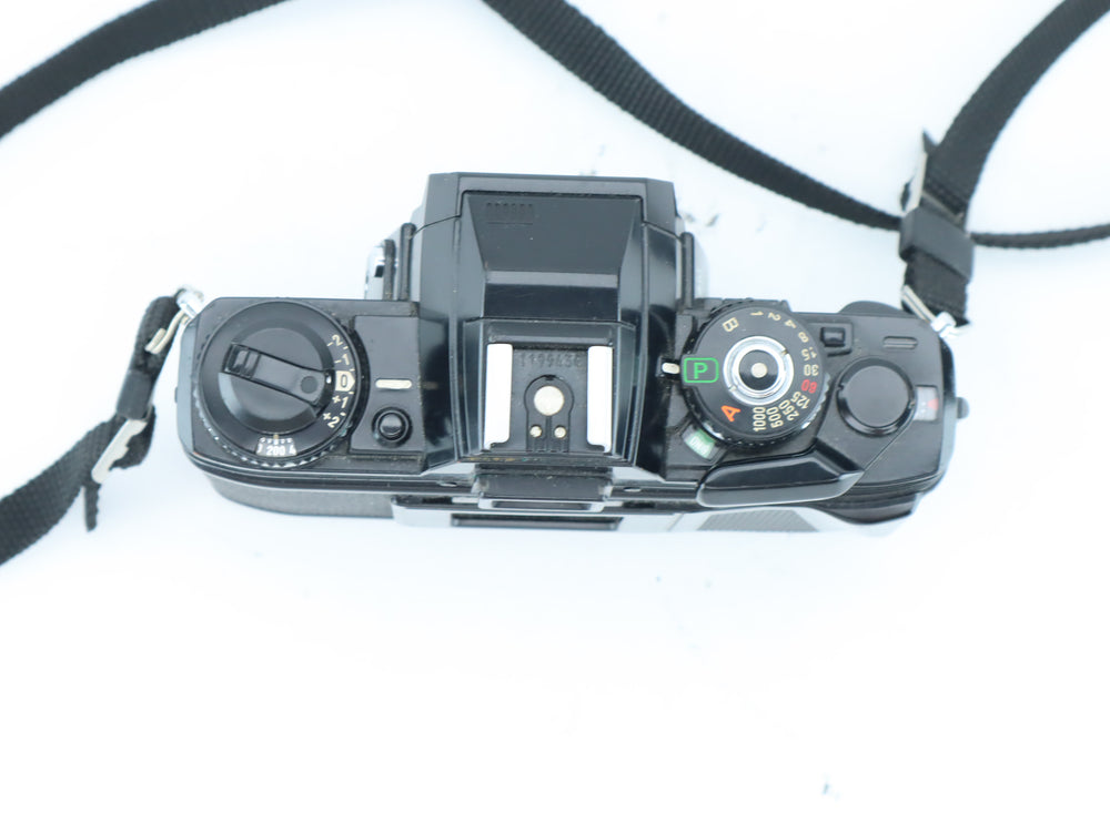 Fully tested and working. Meter responds correctly, shutter fires at all speeds, and viewfinder is clean. Some light cosmetic wear consistent with age.