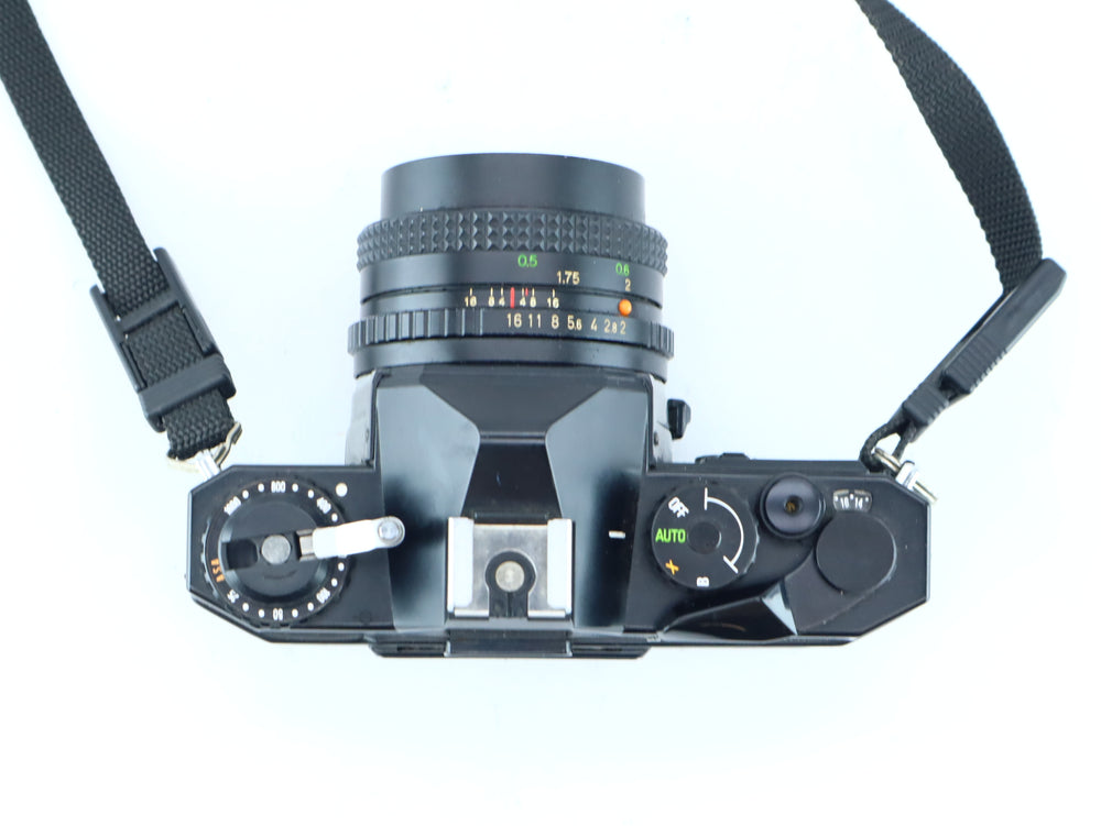 Used – Good condition. The camera is fully functional; shutter fires at all speeds and light meter responds to changes in light. The 50mm f/2 lens is clean and clear, with smooth focusing and aperture control. Some minor signs of use on the body, typical for its age.