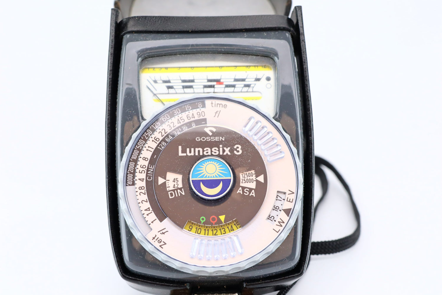 The Gossen Lunasix 3 is a professional exposure meter. The Lunasix 3 introduced the standard incident light dome and meter front end aperture for clip on accessories that featured on every Gossen professional meter. It comes with the original case.