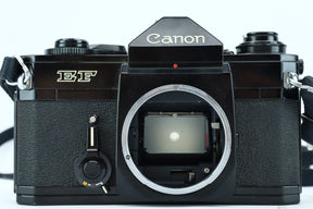 The Canon EF, serial number 340013, is a 35mm film SLR camera produced between 1973 and 1978. Nicknamed the "Black Beauty," the Canon EF was positioned just below the professional F-1 and is notable for combining a mechanical shutter with electronic timing for longer exposures—a unique feature at the time.