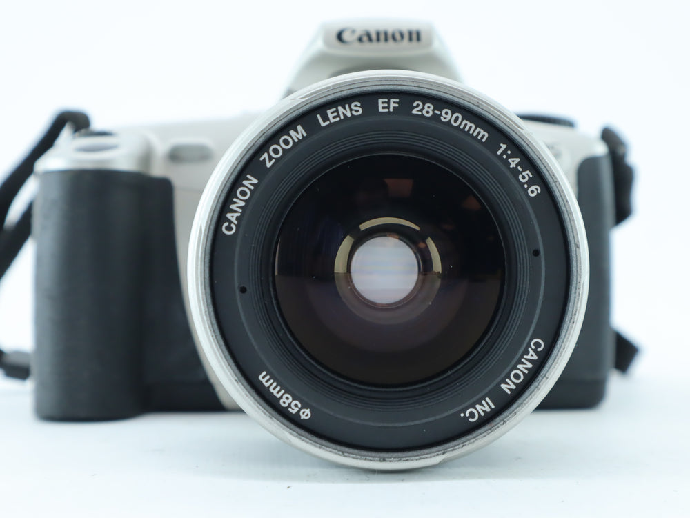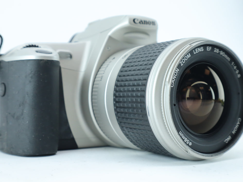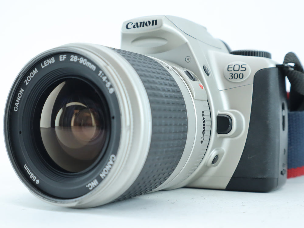 The Canon EOS 300 (also known as the Canon Rebel 2000 in some markets) is a lightweight and user-friendly 35mm film SLR, perfect for both beginners and experienced photographers. Paired with the Canon EF 28-90mm f/4-5.6 zoom lens, this camera offers great versatility, covering wide-angle to short telephoto focal lengths, making it ideal for portraits, landscapes, and travel photography.
