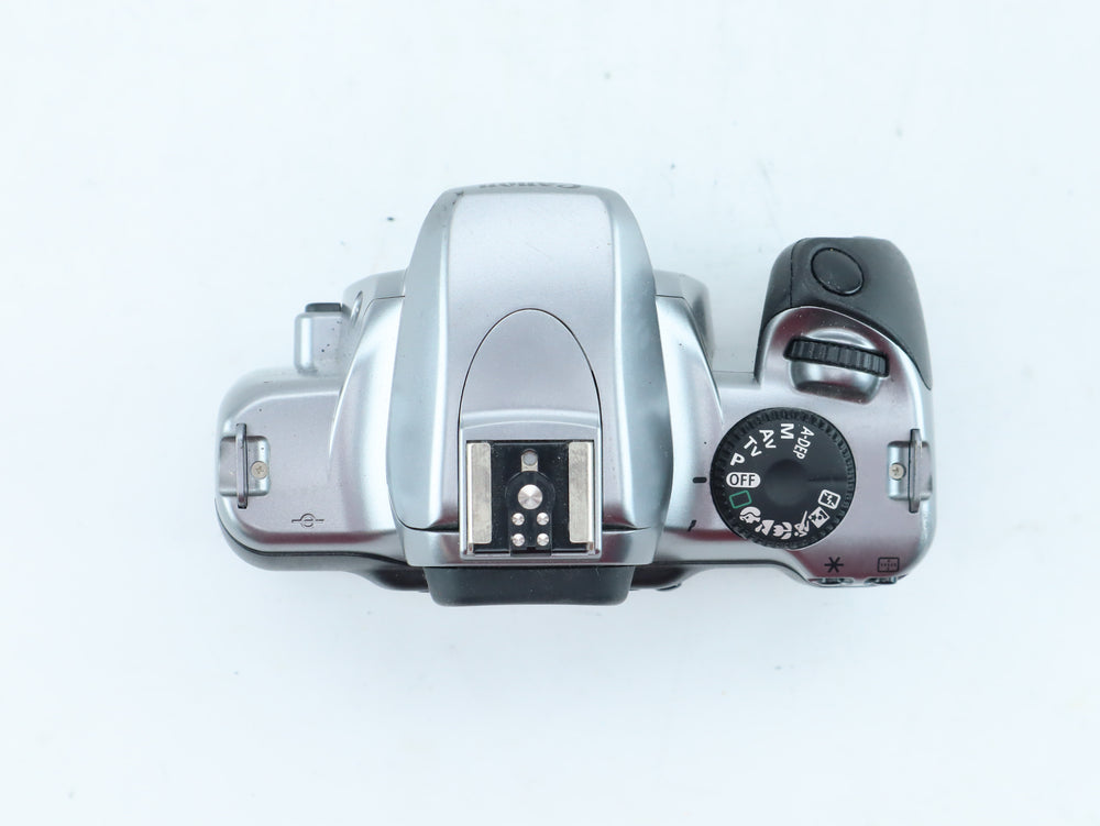 The Canon EOS 3000V (also known as the EOS Rebel Ti in North America) is a sleek and exceptionally lightweight 35mm film SLR that represents the final evolution of Canon's consumer film camera technology. Released in the early 2000s, it features a sophisticated 7-point wide-area autofocus system and a high-speed focal plane shutter, making it incredibly responsive for capturing candid moments and fast-moving subjects. Its silver-finished body is ergonomically designed for comfortable one-handed operation, while the large, illuminated LCD panel on the rear provides clear shooting data at a glance. Fully compatible with the modern EF lens system, the EOS 3000V is the perfect choice for photographers who want the classic look of 35mm film with the convenience and speed of a digital-era camera.