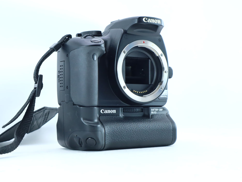 Condition Report Good condition. The camera body (S/N: 0530123850) shows normal signs of light use and minor cosmetic surface marks consistent with its age. The 10.1MP sensor is clean and free from dust. The 2.5-inch LCD is clear and fully functional. The BG-E3 Battery Grip is in excellent condition and all vertical controls are operational. Fully tested and operational at all factory settings.