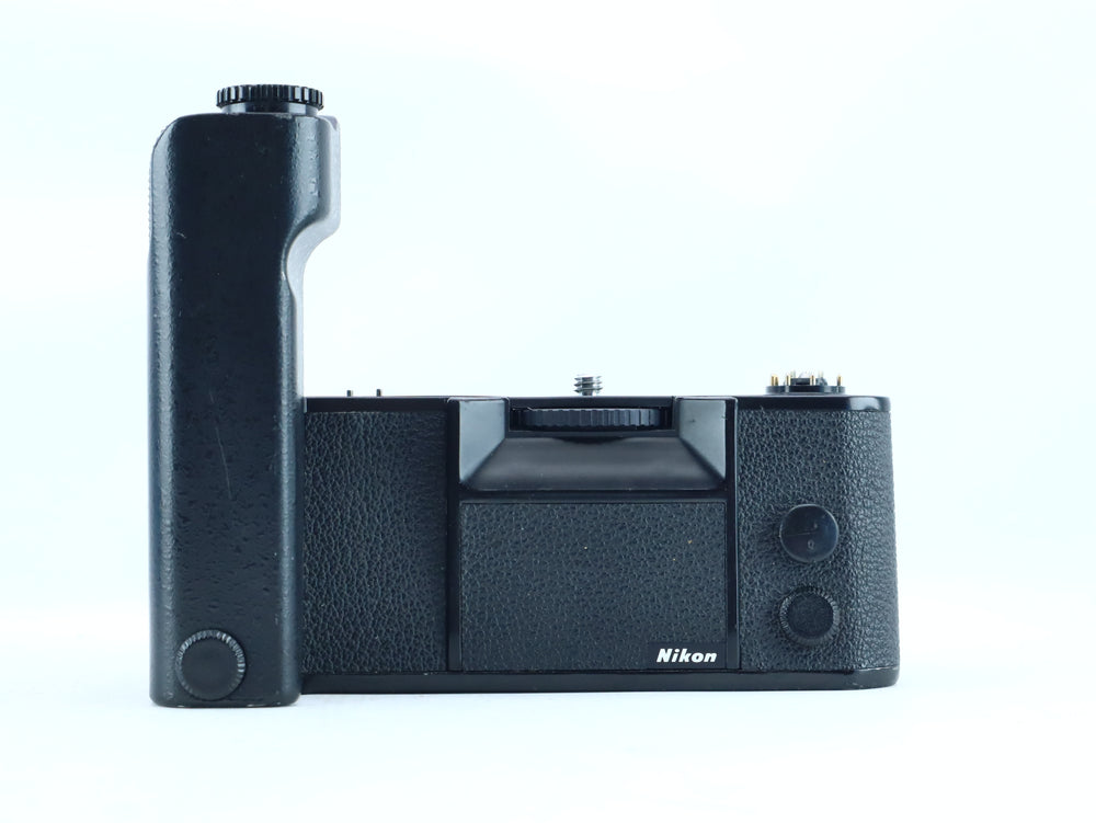 Condition Report Good condition. The motor drive body (S/N: 306296) shows normal signs of professional use, with minor cosmetic paint wear on the edges and base consistent with its vintage status. The battery compartment is clean and free from corrosion. The motor has been tested with a Nikon F3 and is fully functional, including the fire modes and the motorized rewind system. The grip remains secure and the shutter button is responsive.