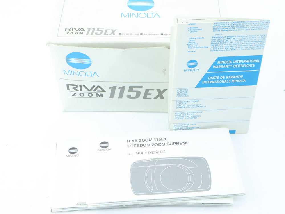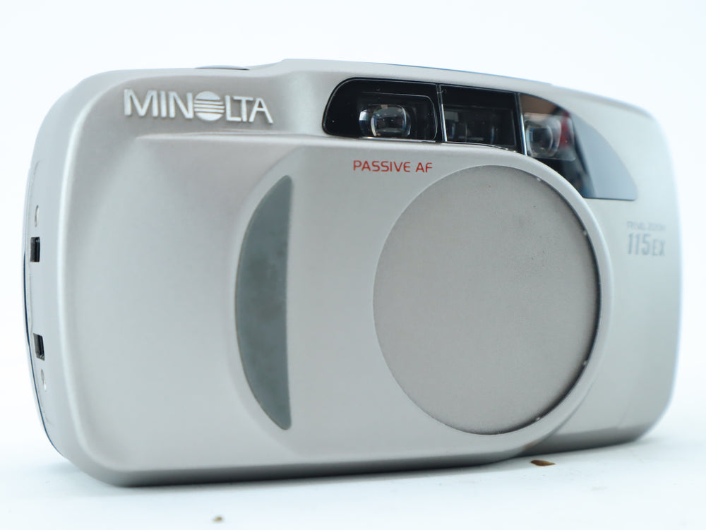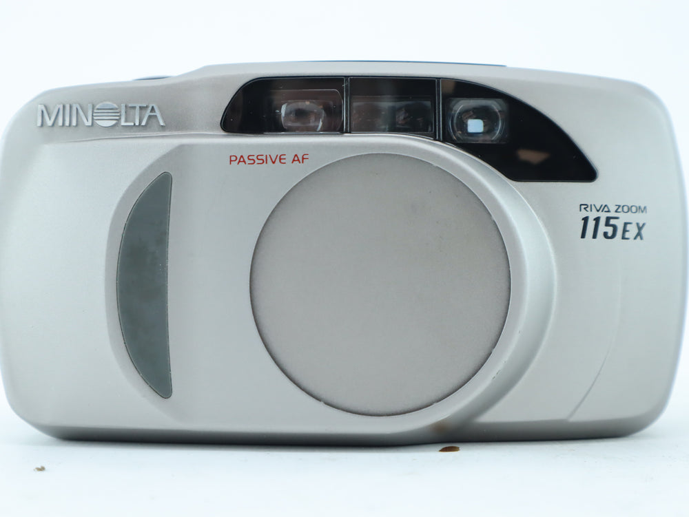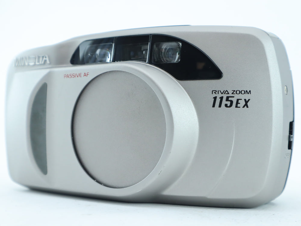 The Minolta Riva Zoom 115EX is a high-quality point-and-shoot 35mm film camera, featuring a versatile 38-115mm zoom lens with macro capability. Designed for ease of use, this camera offers automatic exposure, autofocus, and a built-in flash, making it an excellent choice for travel, everyday photography, and casual film shooting.