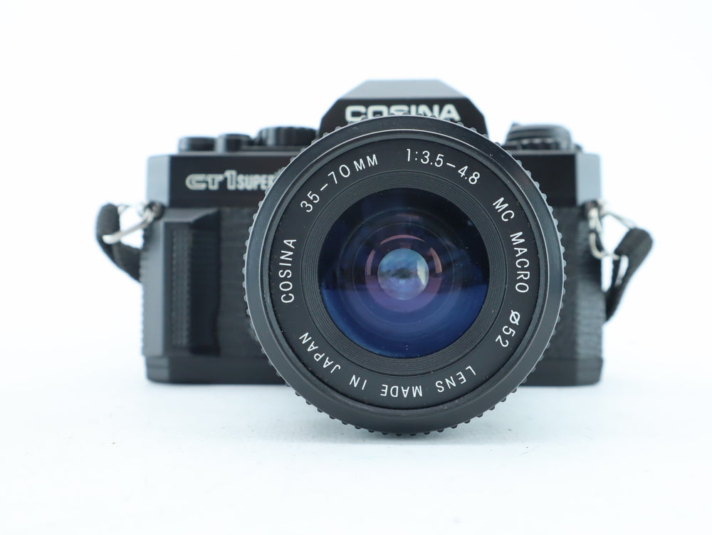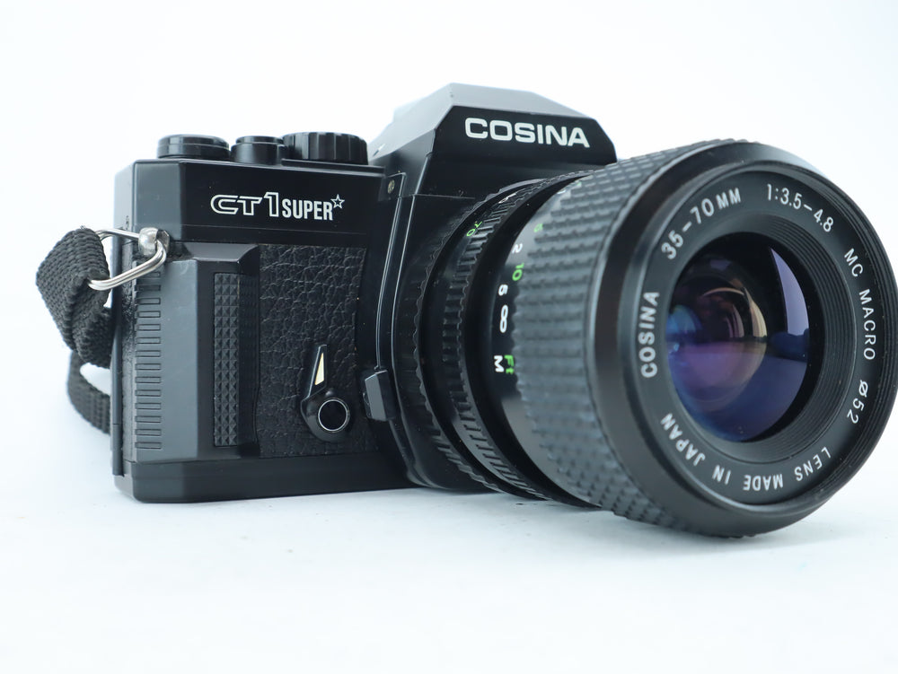 The Cosina CT1 Super is a fully manual 35mm SLR camera, known for its sturdy metal build and reliable performance. It features a bright viewfinder and easy-to-use controls, making it a great option for both beginners and experienced photographers. Paired with the MC Macro 35-70mm f/3.5-4.8, this kit offers a flexible zoom range and macro capability, perfect for portrait, travel, and close-up photography.