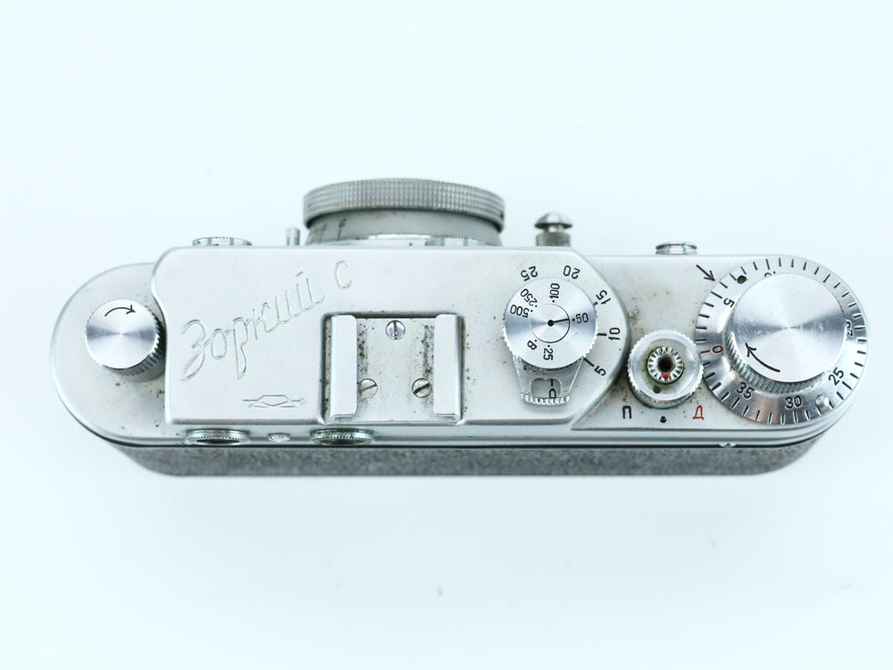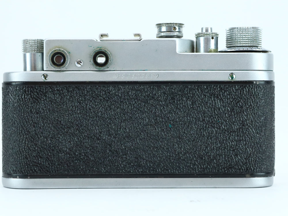 The Zorki-C, serial number 57123610, is a Soviet 35mm rangefinder camera produced in the mid-1950s by KMZ, based on the original Leica II design. The Zorki-C is a transitional model between the Zorki 3 and Zorki 4, and it introduced a built-in flash sync port, which is what the "C" stands for ("С" in Cyrillic, for "синхроконтакт" = synchro contact).