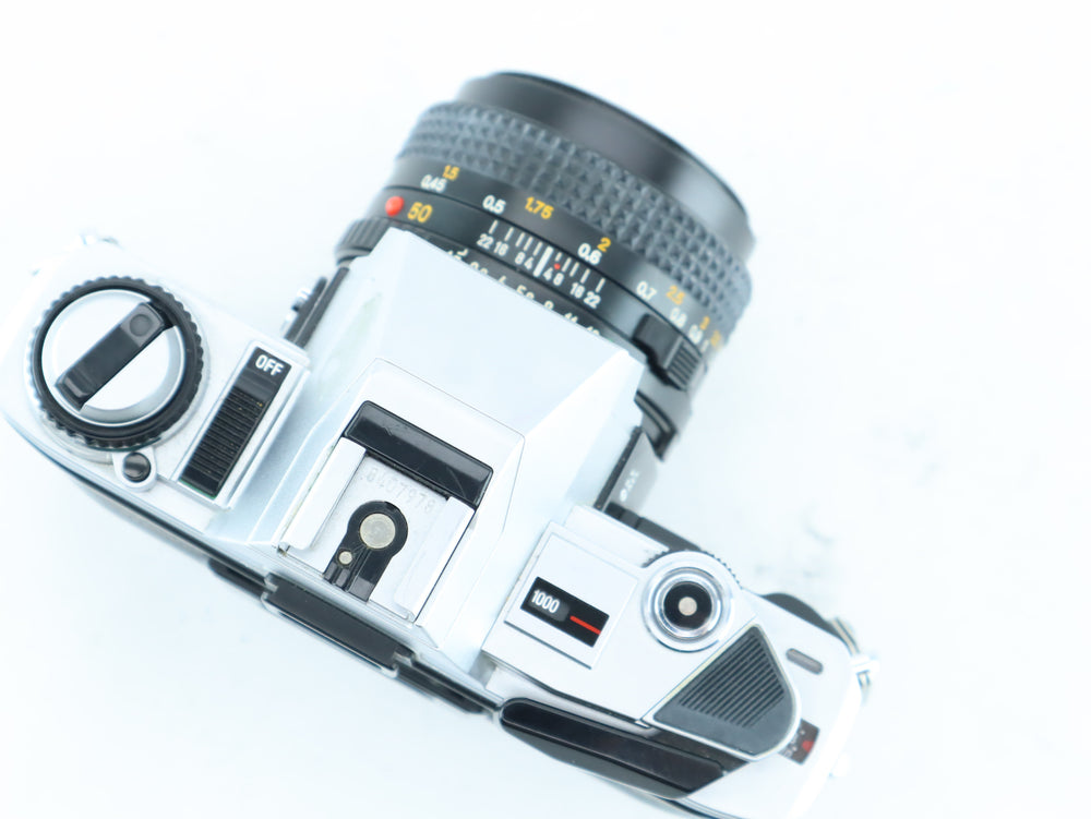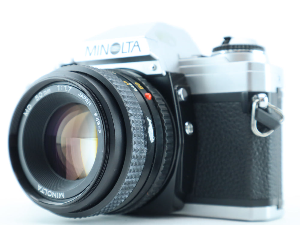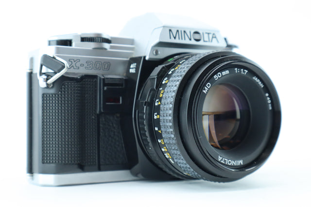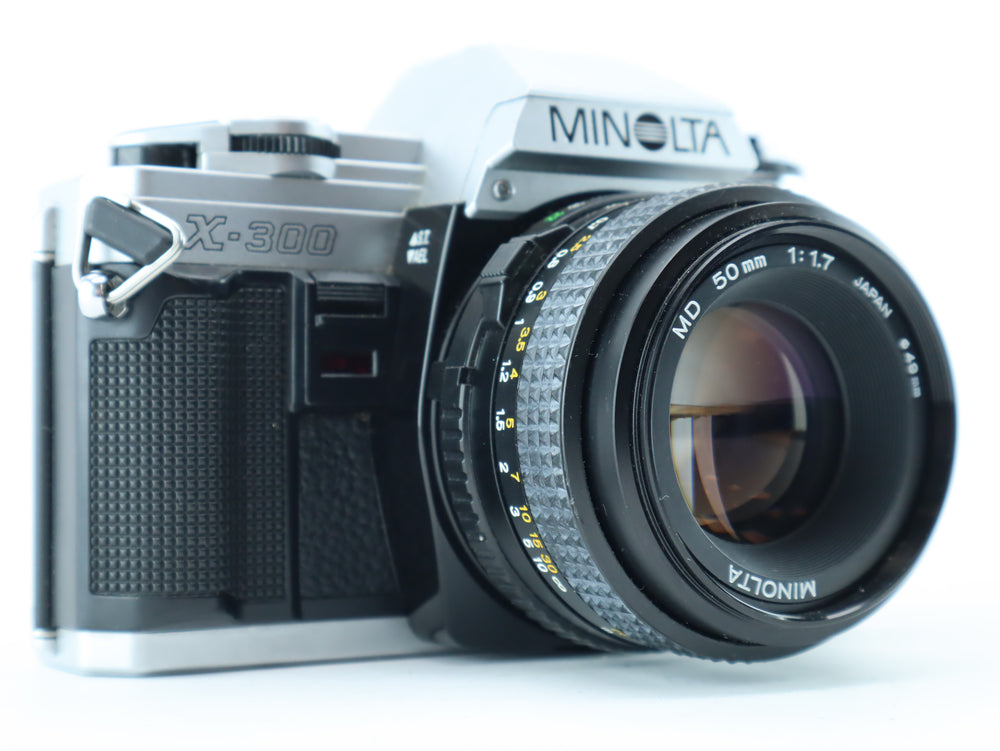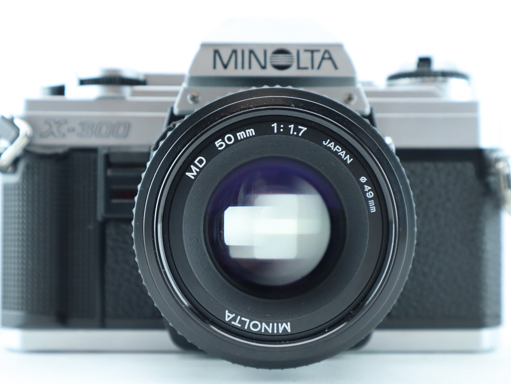 The Minolta X-300 is a manual focus 35mm SLR camera, introduced in the early 1980s as part of Minolta’s popular X-series. Designed with aperture-priority automatic exposure and a bright LED viewfinder, it's a favorite among both beginners and experienced film photographers. Paired with the sharp and fast Minolta MD 50mm f/1.7, this setup is ideal for portraits, street photography, and low-light shooting.