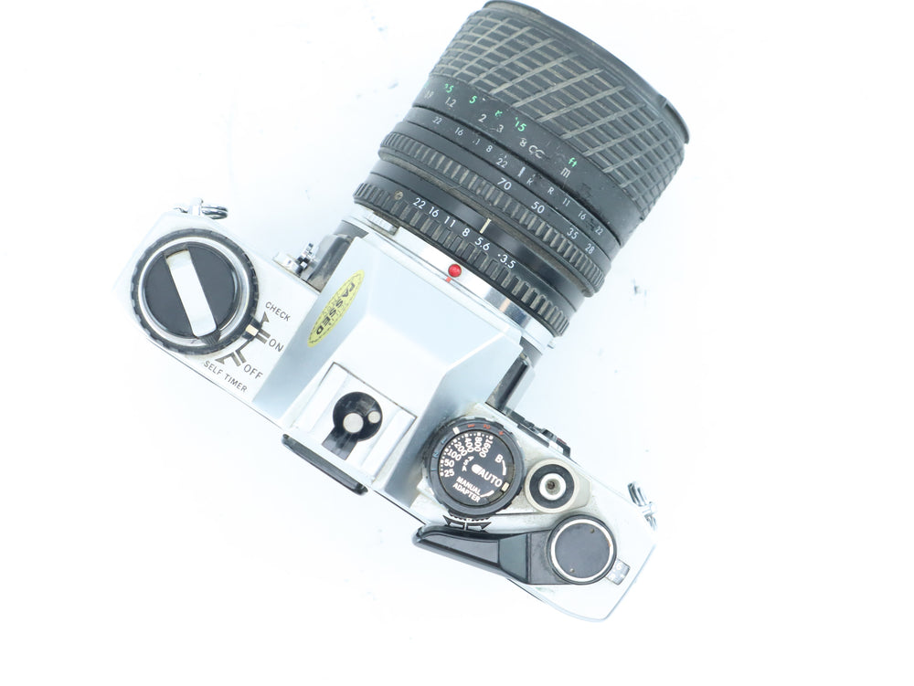 Camera and lens show light signs of use. Shutter, film advance, and metering system tested and working correctly. Lens is clean, focus and zoom move smoothly, and aperture blades are oil-free.