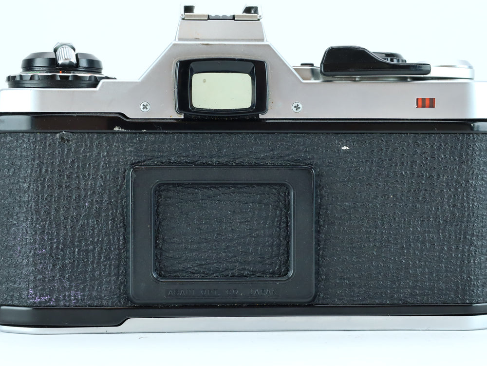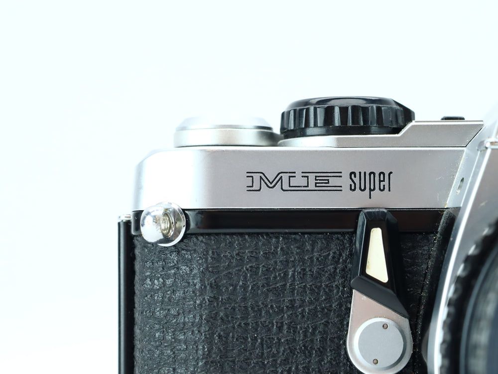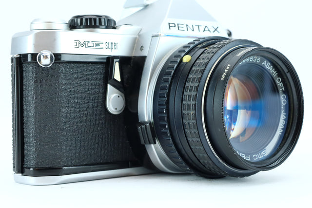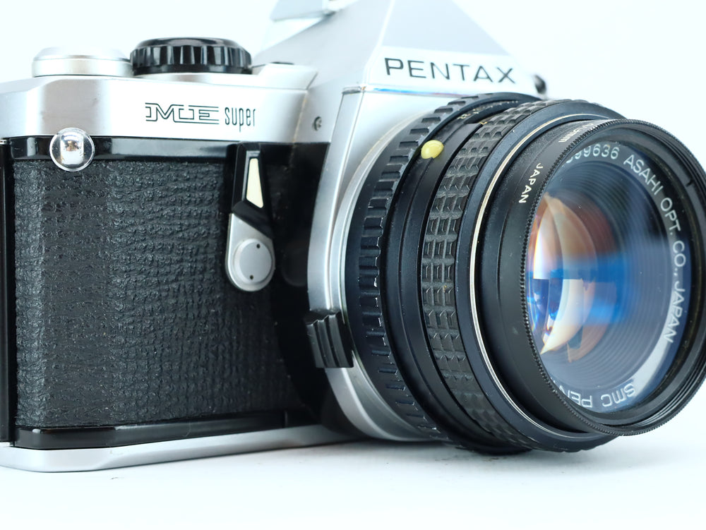 The Pentax ME Super is a sleek and reliable 35mm SLR camera introduced in the early 1980s. Built as an upgrade to the original Pentax ME, it offers both aperture-priority auto exposure and full manual control via up/down buttons for shutter speed adjustment. Its compact size, bright viewfinder, and reliable electronics made it a favorite among enthusiasts and students alike.