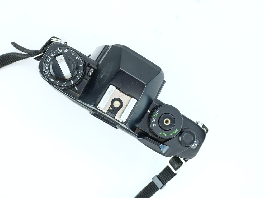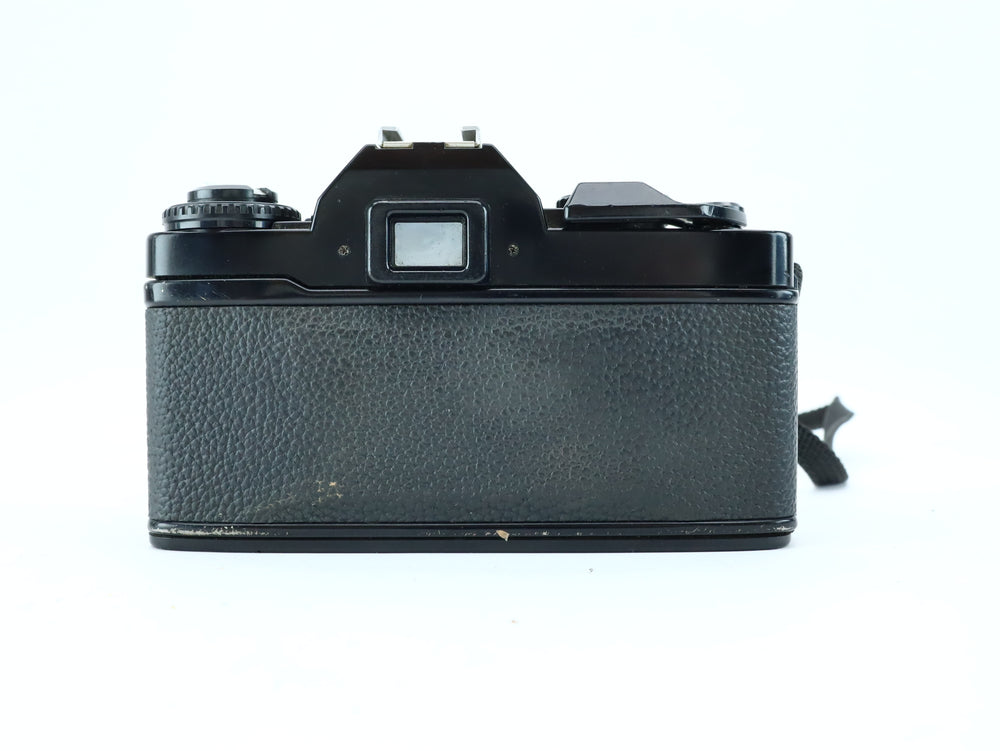 The camera shows moderate cosmetic wear consistent with use. Shutter fires at all speeds and film advance works smoothly. The light meter is responsive (battery required). Viewfinder is clear with some minor dust. A solid mechanical SLR body for everyday 35mm film shooting.