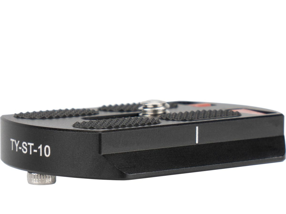 This quick-release plate features a user-friendly thumb screw with a foldable component, allowing for easy tool-free attachment to the 1/4"-20 threaded socket of almost any camera. Constructed from a durable aluminum alloy, the TY-ST10 plate includes a rubberized surface to securely hold your camera in place during use.