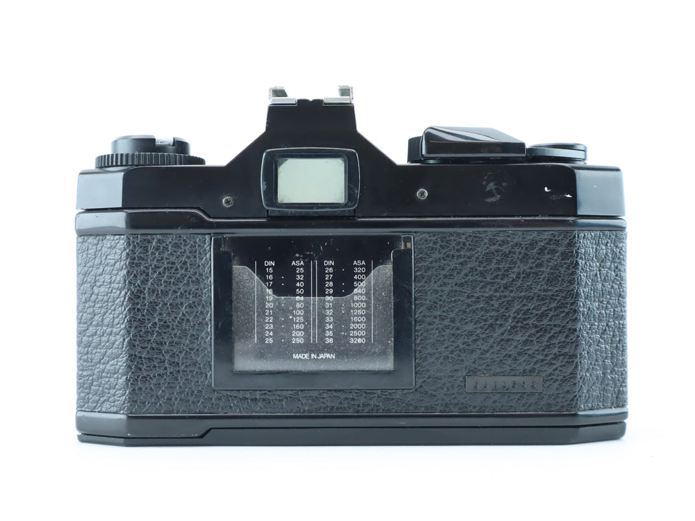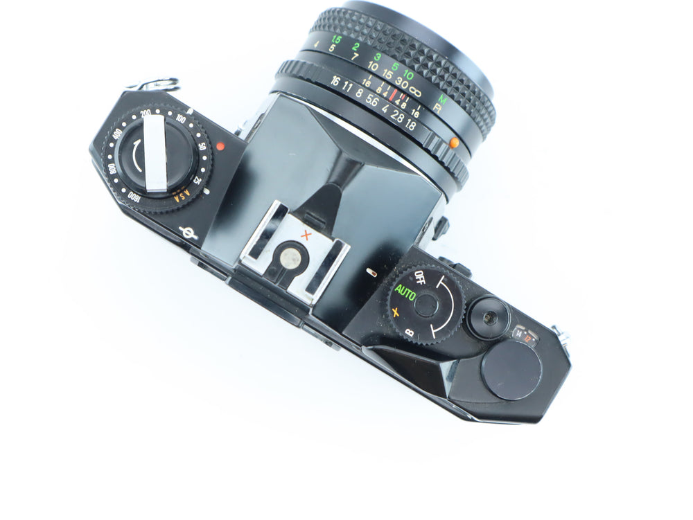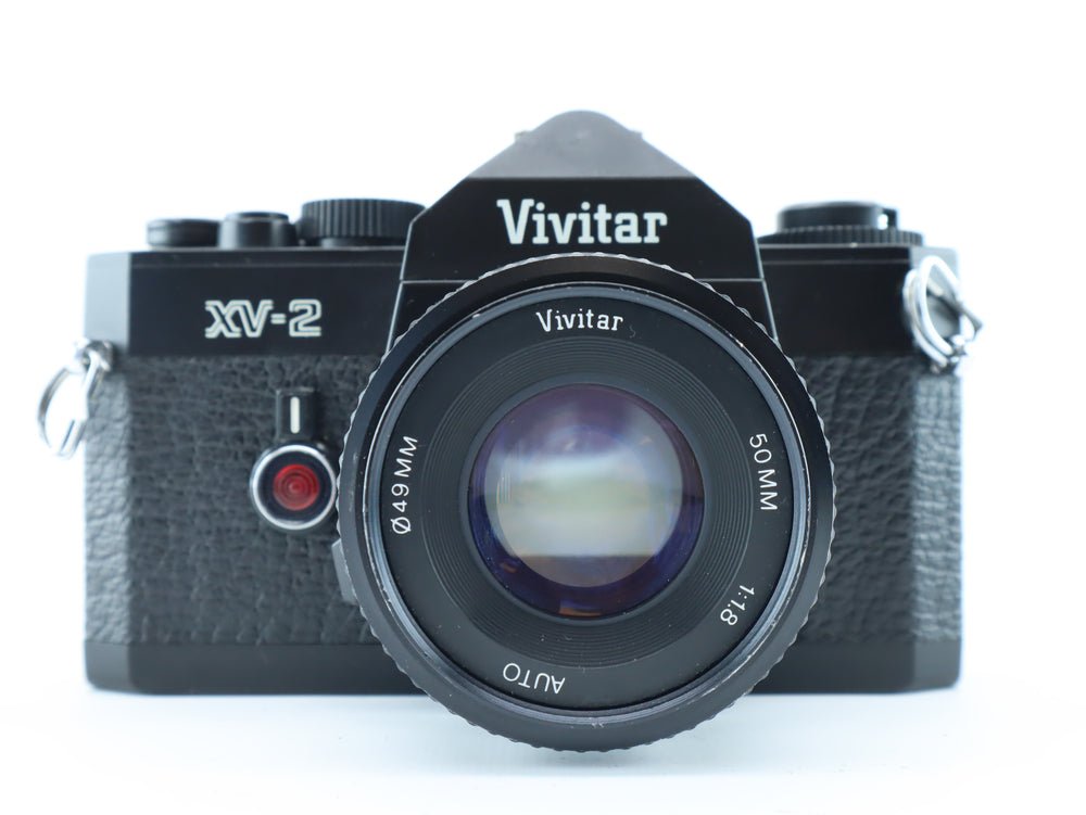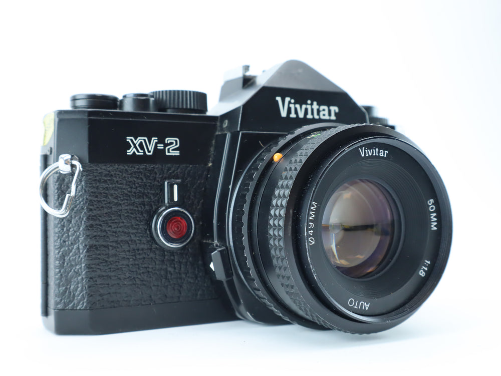 This kit includes a Vivitar 50mm f/1.8 lens, a bright and versatile standard lens that’s great for portraits, street scenes, and everyday shooting. With a simple match-needle metering system and solid all-metal construction, the XV-2 is a straightforward and dependable choice.
