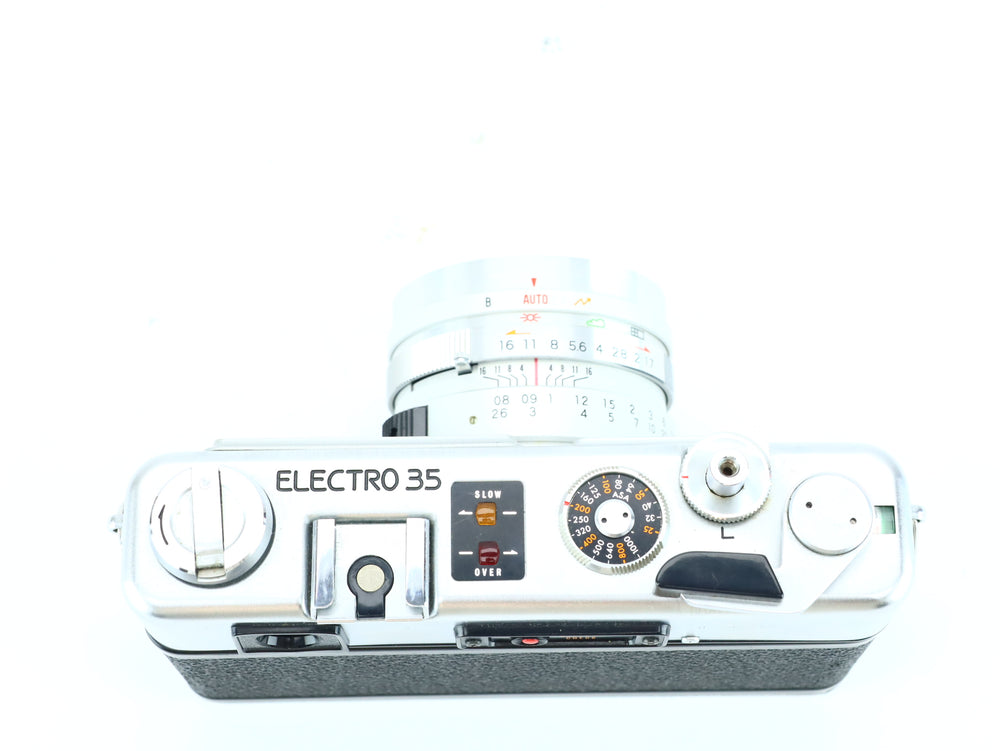 The GSN version adds a hot shoe for electronic flash sync (alongside the PC sync port) and features gold-plated electrical contacts for improved durability. With its large, bright viewfinder and reliable metering system, the Electro 35 GSN is a joy to shoot and remains a favorite among film enthusiasts and collectors.