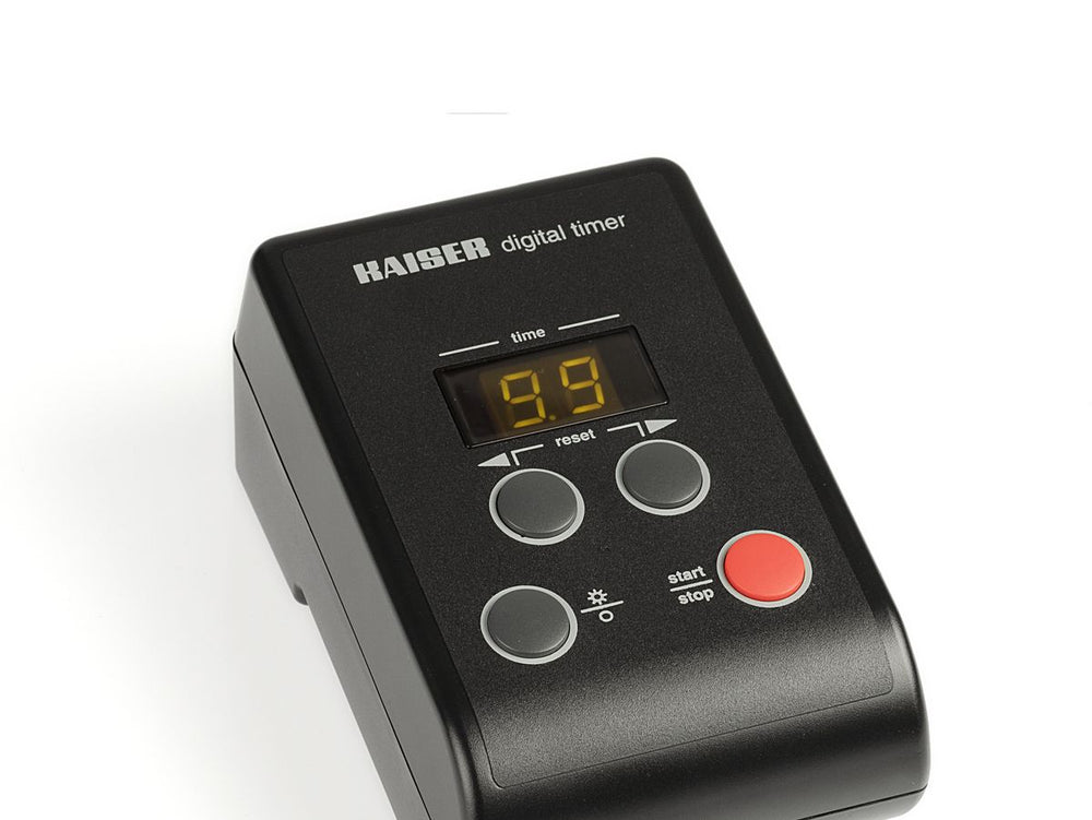 The Kaiser Digital Timer is a sophisticated electronic device designed for precision lighting control. Featuring a two-digit amber-colored digital display, this timer allows users to easily keep track of time intervals during photography sessions or other lighting setups.