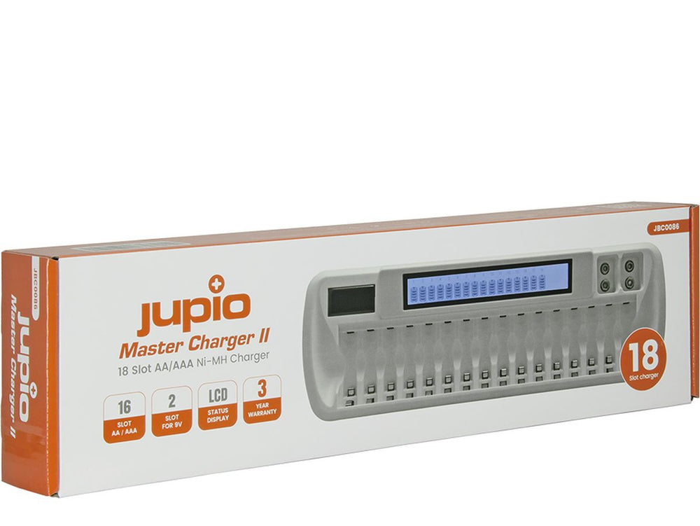The Jupio Master Charger II is an efficient device designed to charge up to 16 rechargeable AA or AAA batteries simultaneously. In addition to these, it can also accommodate two rechargeable 9V batteries. This model features a secure charging process to protect the batteries during use.