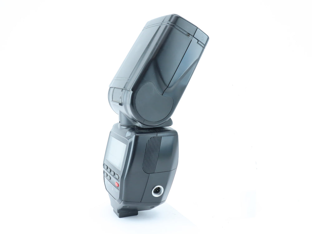 The flash shows light cosmetic wear consistent with age. The battery compartment is clean, the flash charges and fires correctly, and all buttons respond as expected. The bounce mechanism and zoom head operate smoothly.