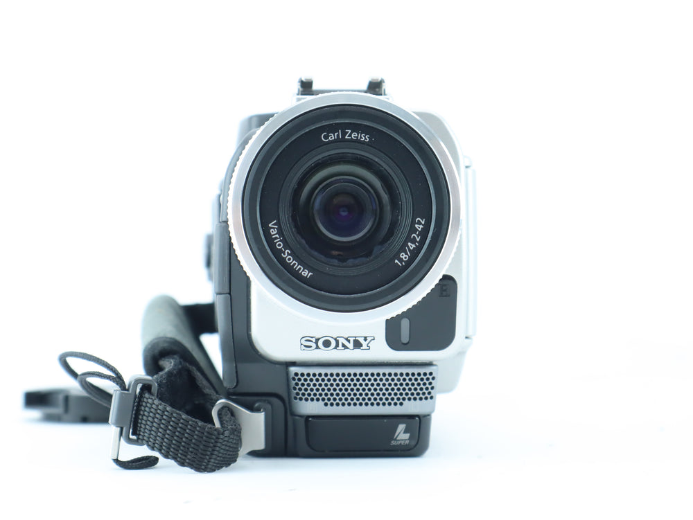 This Sony Handycam is a compact digital camcorder designed for everyday filming, featuring a Carl Zeiss Vario-Sonnar 1.8/4.2–42mm lens with outstanding optical quality and a 40x digital zoom for bringing distant subjects closer.