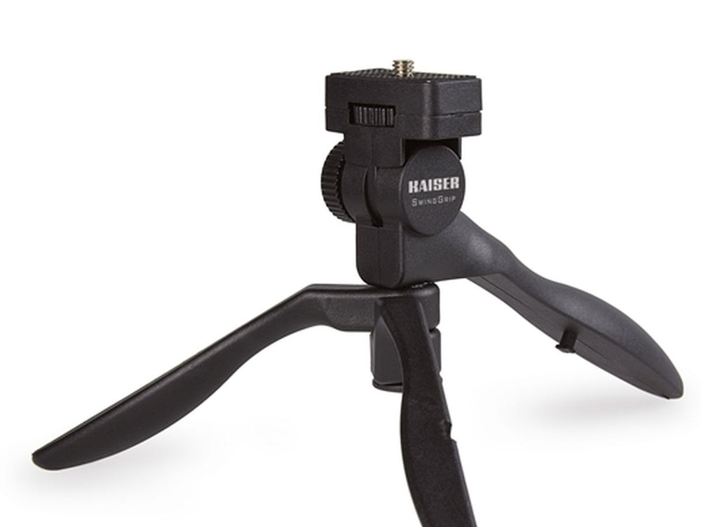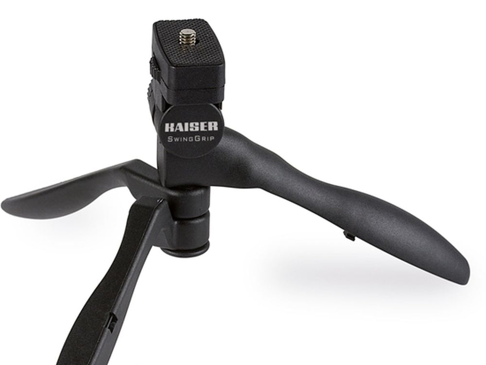 The Kaiser Swing Grip, a unique table tripod, is also functional as a tabletop handle. It is designed to accommodate digital cameras with a weight of up to 2 kg, thanks to its 1/4" threading. Despite its compact size, this upright stand reaches a maximum height of 11.5 cm.