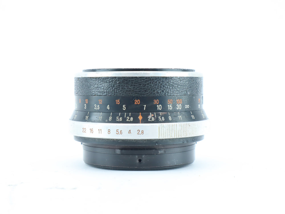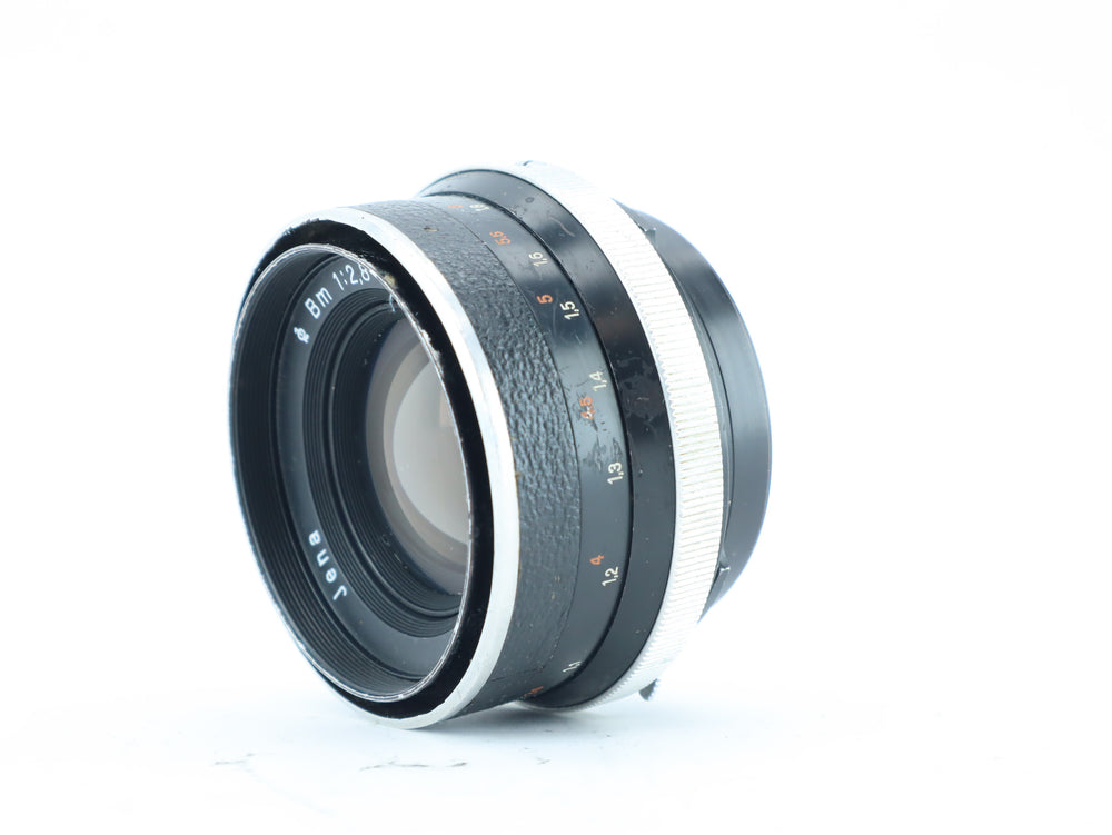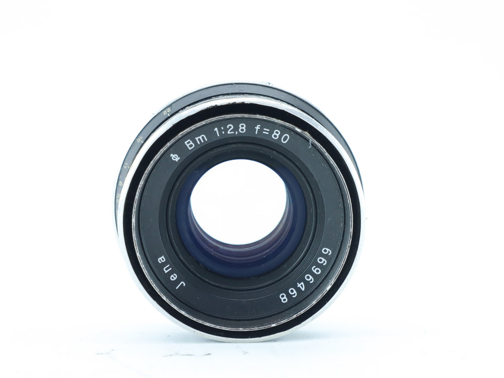 The Jena BM 80mm f/2.8 is a classic medium-format manual focus lens, made in East Germany by Carl Zeiss Jena. It features a bright f/2.8 aperture, making it well-suited for portraits, still life, and general medium telephoto use. The lens is built with high-quality optics and a solid all-metal barrel.