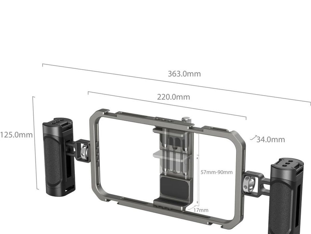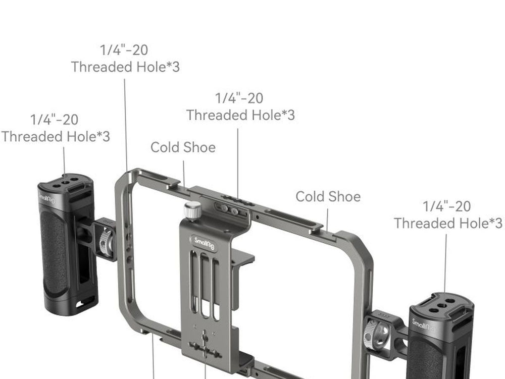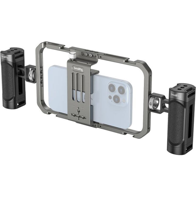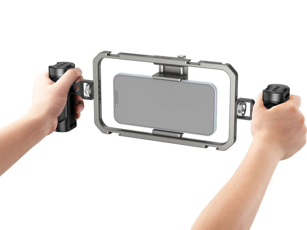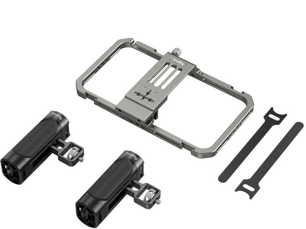 The SmallRig 4121 All-in-One Basic Video Kit provides a compact and lightweight solution for recording and live streaming using your smartphone. This kit furnishes you with an all-inclusive set of tools consisting of a universal smartphone case, a pair of side handles, and cable ties. The specially designed case incorporates multiple 1/4"-20 threaded holes and a cold shoe mount. This makes attaching various accessories rather simple and facilitates an array of creative possibilities.