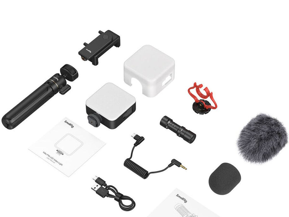 Included in the package are a variety of items for a full-fledged vlogging experience: Vlog Tripod VT-10, Smartphone Holder, Wave S1 Lite Microphone, Shock Mount, Windshield Foam Cover, Furry Windscreen, 3.5 mm TRS to Type-C Cable, Type-C to Lightning Adapter, User Manuals for the Microphone and the LED Video Lamp, Vibe P96 LED Video Lamp, Diffuser, Type-C Charging Cable, and a Carry Bag.