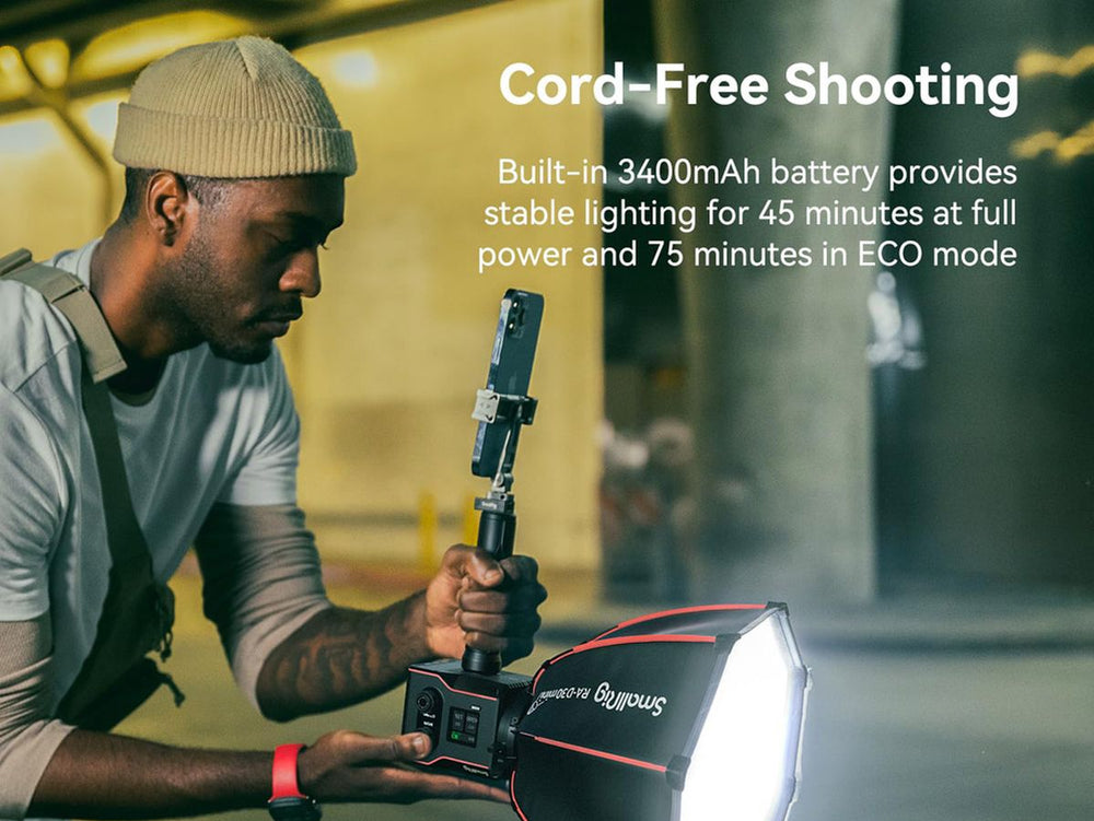 Equipped with an integrated 49 Wh battery, the RC 60B delivers consistent and predictable illumination, operating for 45 minutes at maximum power, and 75 minutes in ECO mode. Its compact and lightweight design (650g), coupled with its one-hand operation, makes it a highly versatile tool for any filming context.