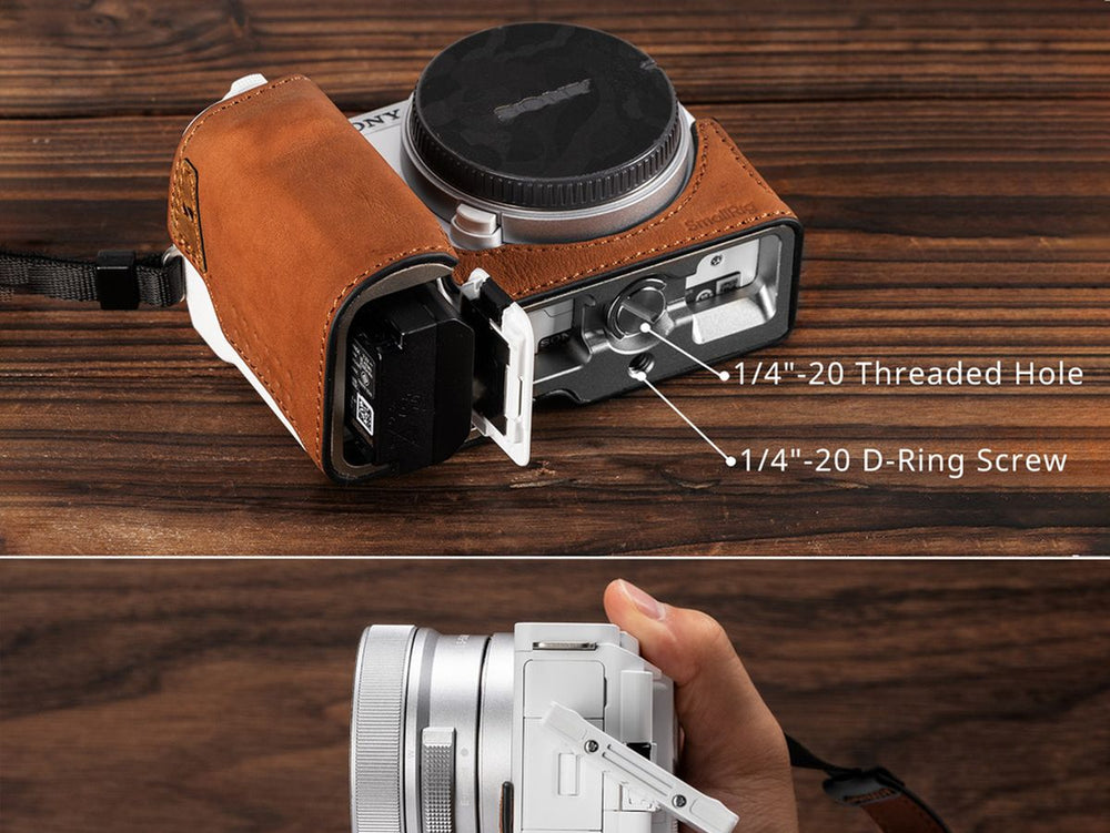 The leather case design facilitates unobstructed access to essential camera features such as the battery compartment, focus mode, and memory card slot. The framework of the case incorporates space-grade aluminium, ensuring not just a perfect fit but also safeguarding the camera from bumps and shocks.