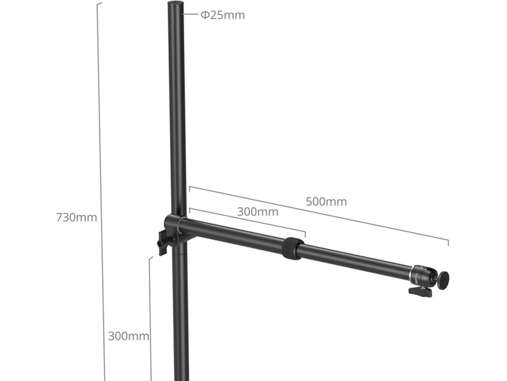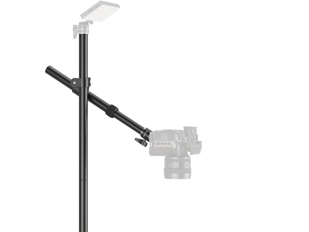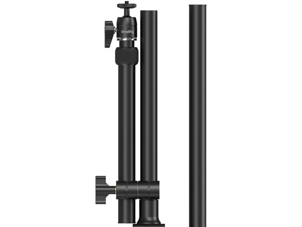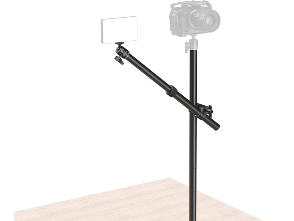 What further augments the utility of this kit is its modular design that allows for quick assembly and disassembly by detaching the extension rod and elongating the boom arm. The top of the main arm contains a 1/4"-20 threaded hole. In contrast, the boom arm's top comes equipped with a detachable 360° ball head, enabling the desktop support kit to secure two devices simultaneously. This multi-device compatibility makes it an ideal setup solution for desktop recording.