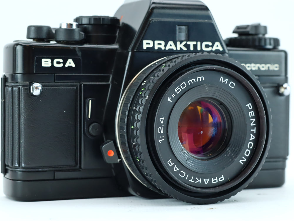 The Praktica BCA electronic is a 35mm SLR camera made in East Germany by Pentacon Dresden, introduced in the early 1980s. Part of the Praktica B-series, it features a modern bayonet mount (PB mount), lightweight plastic body, and aperture priority auto exposure — making it one of the more accessible manual SLRs of its era.