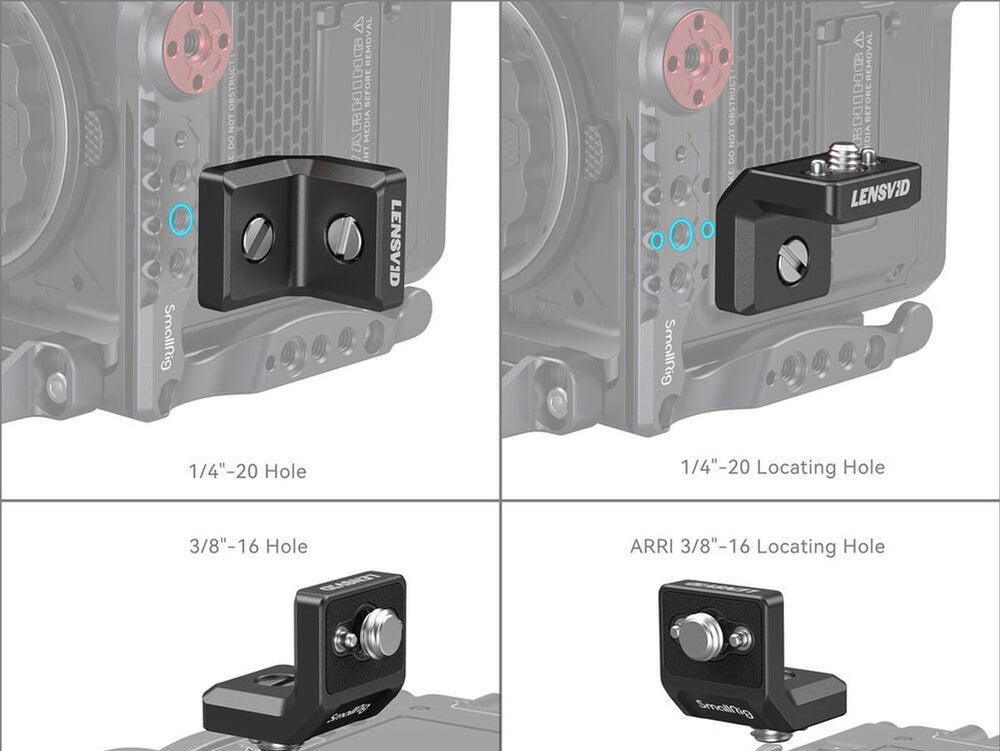 The kit provides a compact solution for a 90-degree angled setup for equipment and accessories, such as wireless image transmitters, monitors, V-mount mounting plates, etc., making camera gear more compact. Built-in 1/4"-20 screws, retractable localization pins, and 3/8"-16 screws make it highly compatible with various mounting interfaces.