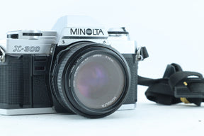 The Minolta X-300 MD is a classic 35mm manual-focus SLR camera, paired here with the popular Minolta MD 50mm f/1.7 standard lens.