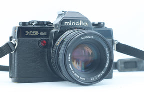 This Minolta XG-SE with serial number SR 1824892 comes paired with the Minolta MD Rokkor 50mm f/1.7 lens, serial number SR 2625595. The XG-SE is a dependable 35mm SLR camera known for its aperture-priority automatic mode, bright viewfinder and classic Minolta ergonomics. Combined with the sharp and reliable MD Rokkor 50mm f/1.7, this set offers excellent image quality and smooth manual operation, making it a strong choice for both beginners and experienced film photographers.