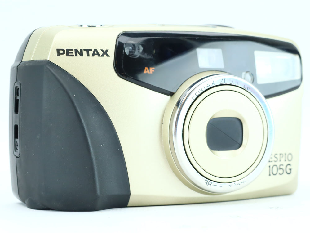 The Pentax Espio 105G is a compact 35mm point-and-shoot camera designed for everyday photography with convenience and reliability in mind. It features a 38–105mm zoom lens, fully automatic exposure, and built-in flash, all wrapped in a lightweight, ergonomic body. Ideal for travelers or beginners, it delivers sharp results with minimal effort.