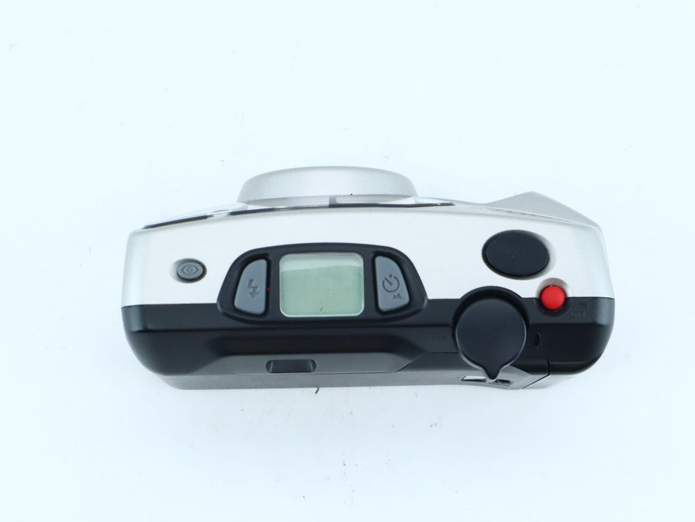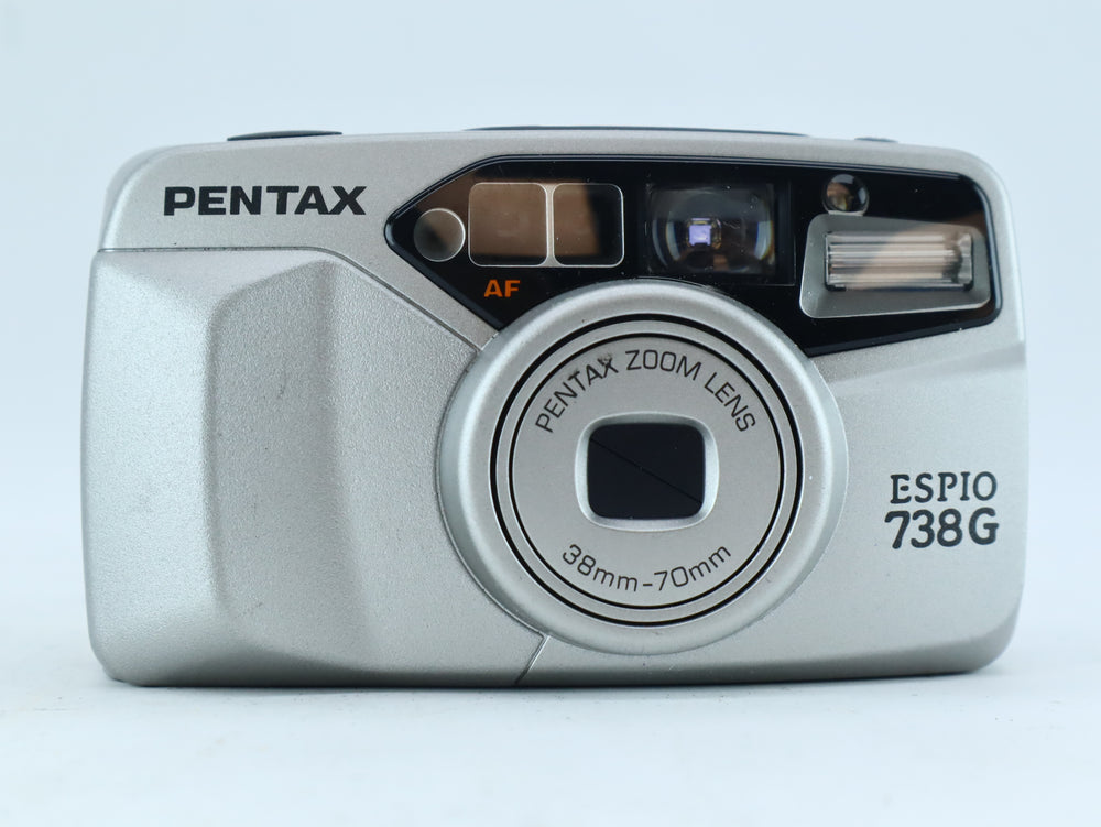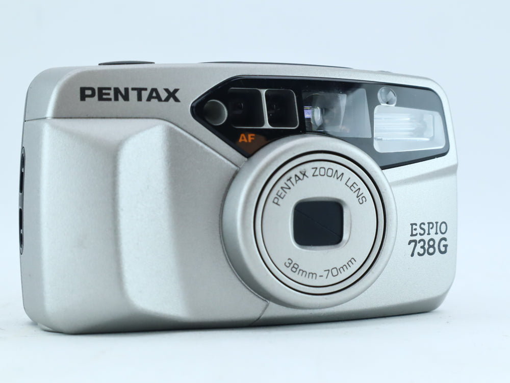 The Pentax Espio 738G is a sleek and capable 35mm compact film camera featuring a 38–70mm zoom lens, autofocus, and full auto exposure. Known for its compact design and sharp lens performance, it's a great choice for everyday photography, travel, or street shooting.