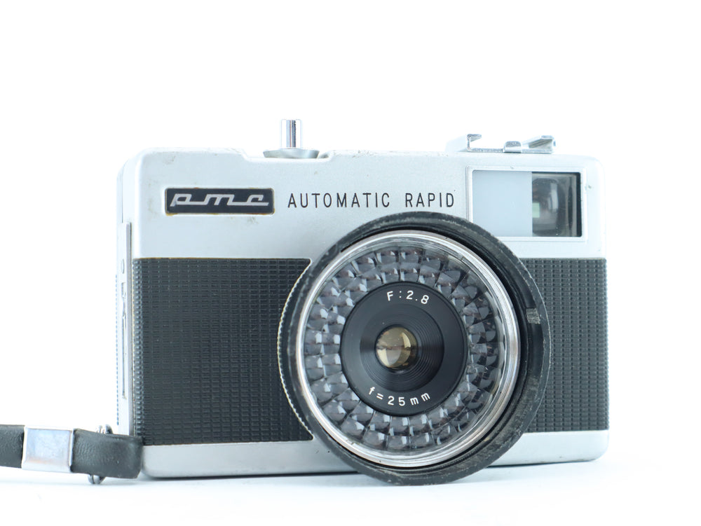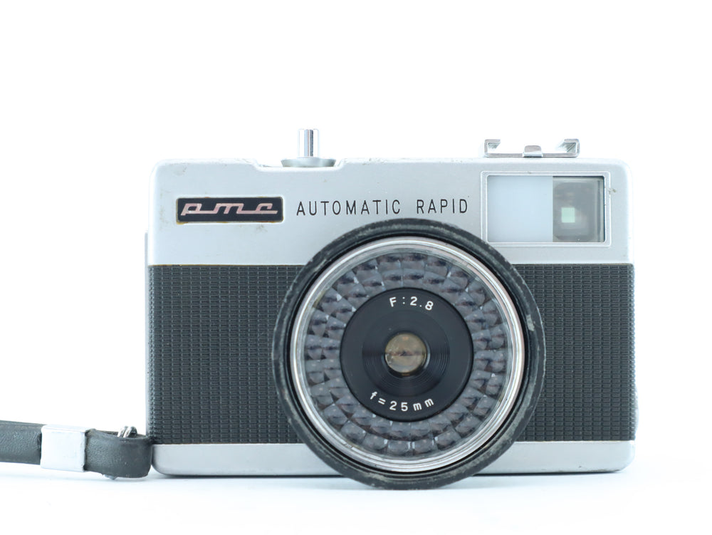 The PMC Automatic Rapid is a compact and stylish 35mm film camera that uses the unique Rapid film cartridge system, popular in the 1960s and 70s. Designed for simplicity and speed, it features automatic exposure control, making it easy to capture well-exposed images without manual adjustments. Its fixed-focus lens and lightweight body make it an ideal choice for vintage camera collectors or film photography beginners.