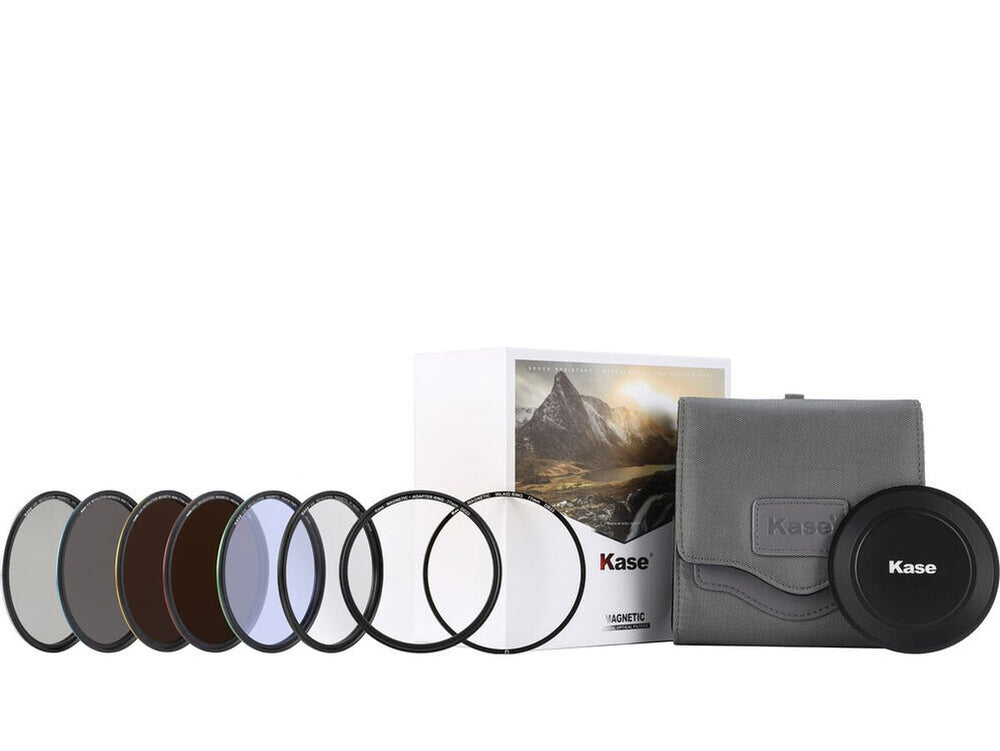 The Kase Revolution MEGA ND kit features a set of six expertly crafted filters that are part of Kase's innovative KW Revolution magnetic filter system. This versatile kit includes filters with varied densities and functionalities: ND8, ND64, ND1000, CPL, Neutral Night, and R.MCUV. Each filter is designed with uniquely color-coded frames, making identification and swapping quick and easy.