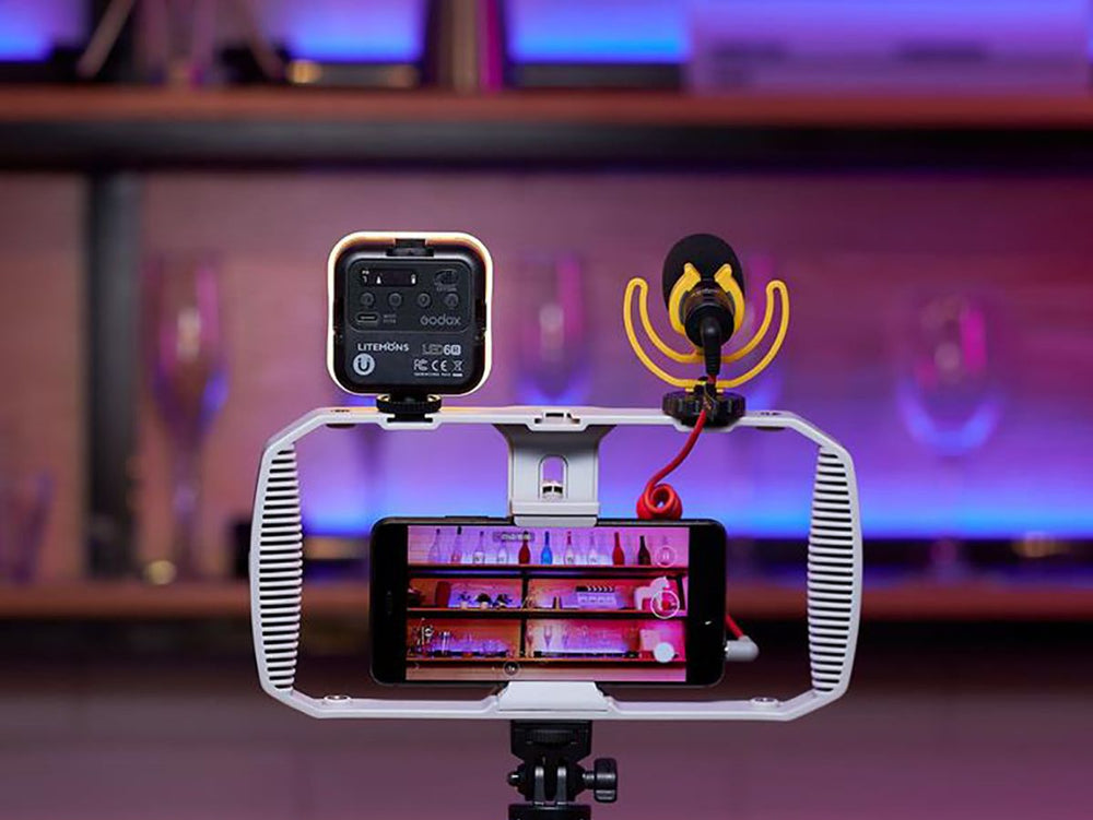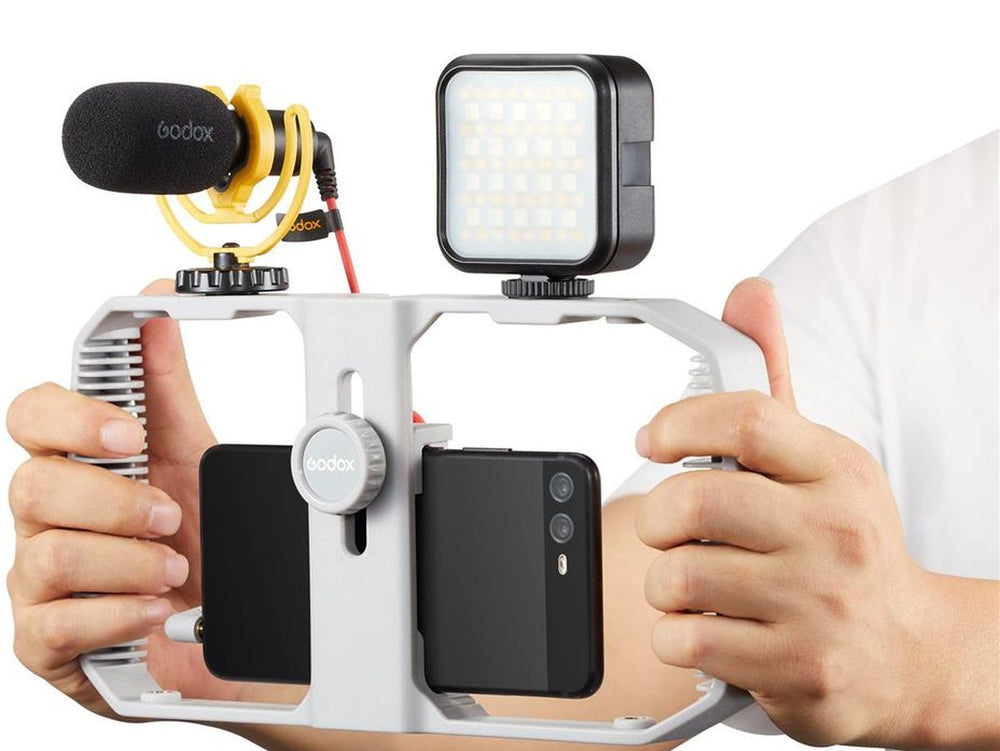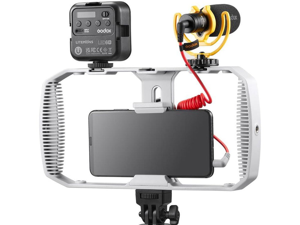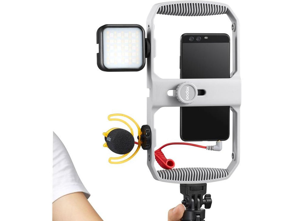 The Godox Vlogging kit VK1-AX 3.5mm is designed perfectly to transform your smartphone with AUX (3.5 mm) into a high-end recording studio. It enables you to produce vlogs, films, and live streams with superior image and sound quality. The kit is equipped with a standalone video kit for optimum audio and video production. With a detachable Versatile Litemon LED6R featuring RGB LED lighting, your recordings are set to have the perfect ambiance.