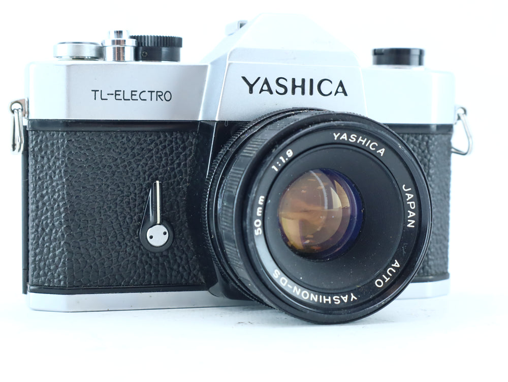 The Yashica TL Electro is a sturdy and reliable 35mm SLR camera from the early 1970s, featuring through-the-lens (TTL) metering with electronic exposure indication. Paired with the Yashica Auto 50mm f/1.9, this kit offers a classic shooting experience with bright optics and smooth manual focusing.