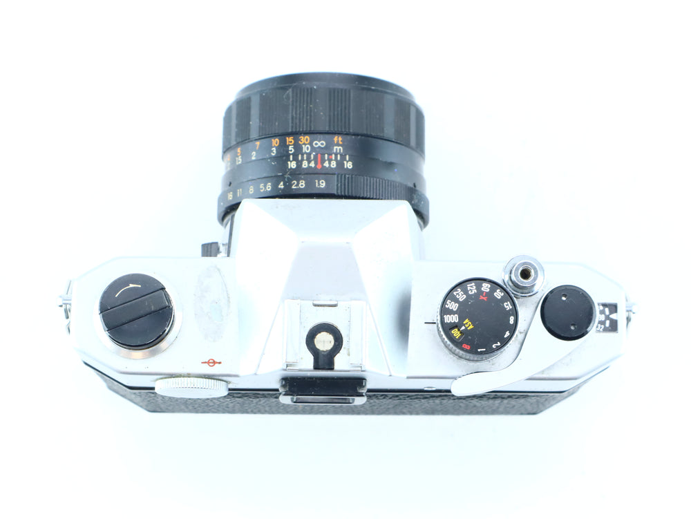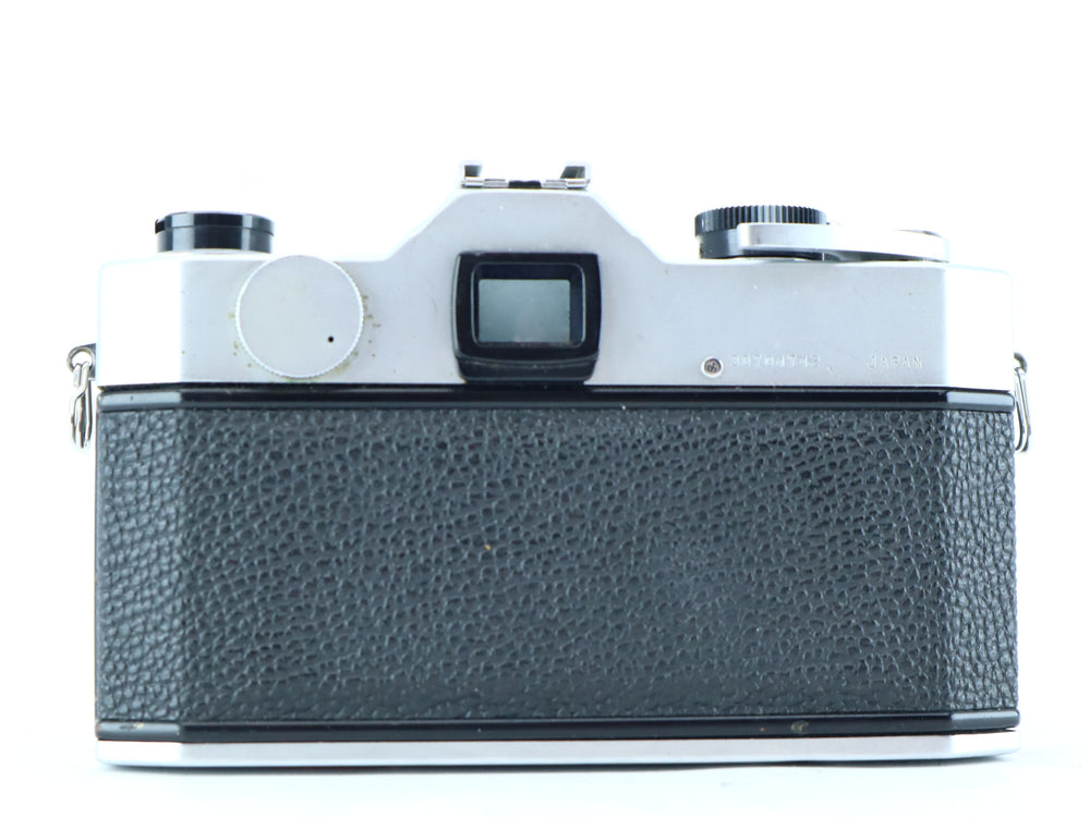 Used – Good condition. Camera and lens are in good working order. Lens glass is clean, with smooth focus and aperture rings. Light meter is untested. Minor cosmetic signs of age on body and leatherette.