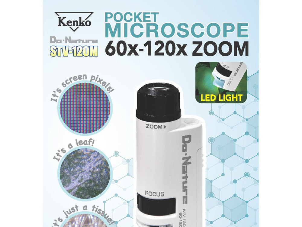 The Kenko Zoom Micro Scope STV-120M is a user-friendly microscope that offers the convenience of portability, allowing you to take it outdoors. It features a zoom capability ranging from 60 to 120 times, enabling you to tailor the magnification to fit your viewing preferences. The microscope comes with an integrated LED light, ensuring that the object you're viewing is bright and visually accessible.