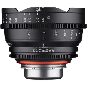 The XEEN 14mm T3.1 lens is specifically designed for film usage. It features an internal focus design that prevents the lens from altering its size while focusing, which minimizes the appearance of unwanted effects during focus shifting. Each lens within the set is multi-coated for high contrast, glare prevention, and colour matching to a factory standard, allowing you to put together a set with minimal colour shift. This 14mm lens provides a normal image on full-frame cameras and tighter angle of view on smaller formats. The lens includes: